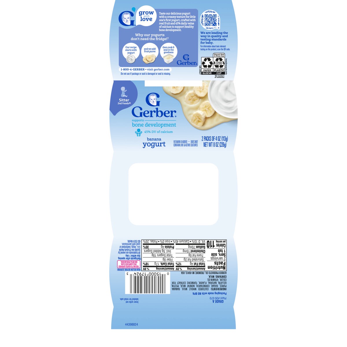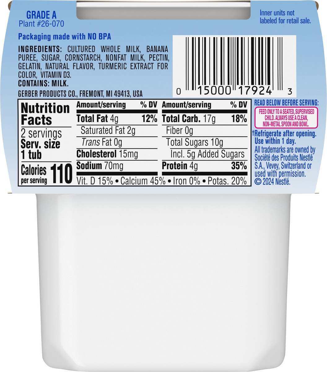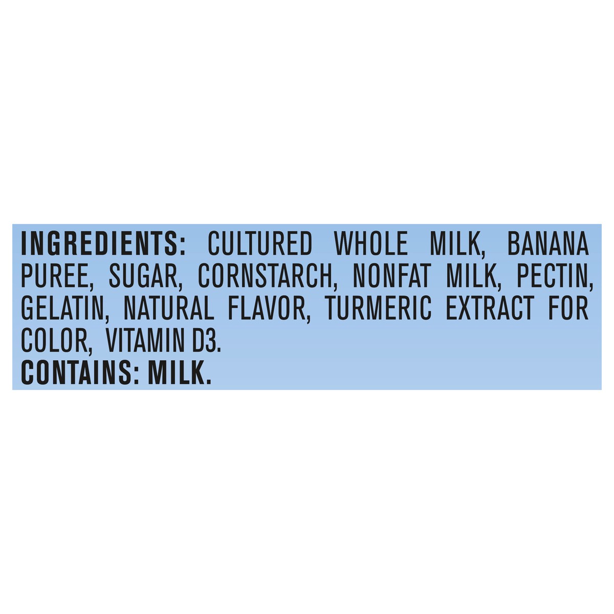 Cultured Whole Milk, Banana Puree, Sugar, Cornstarch, Nonfat Milk, Pectin, Gelatin, Natural Flavor, Turmeric Extract for Color, Vitamin D3.