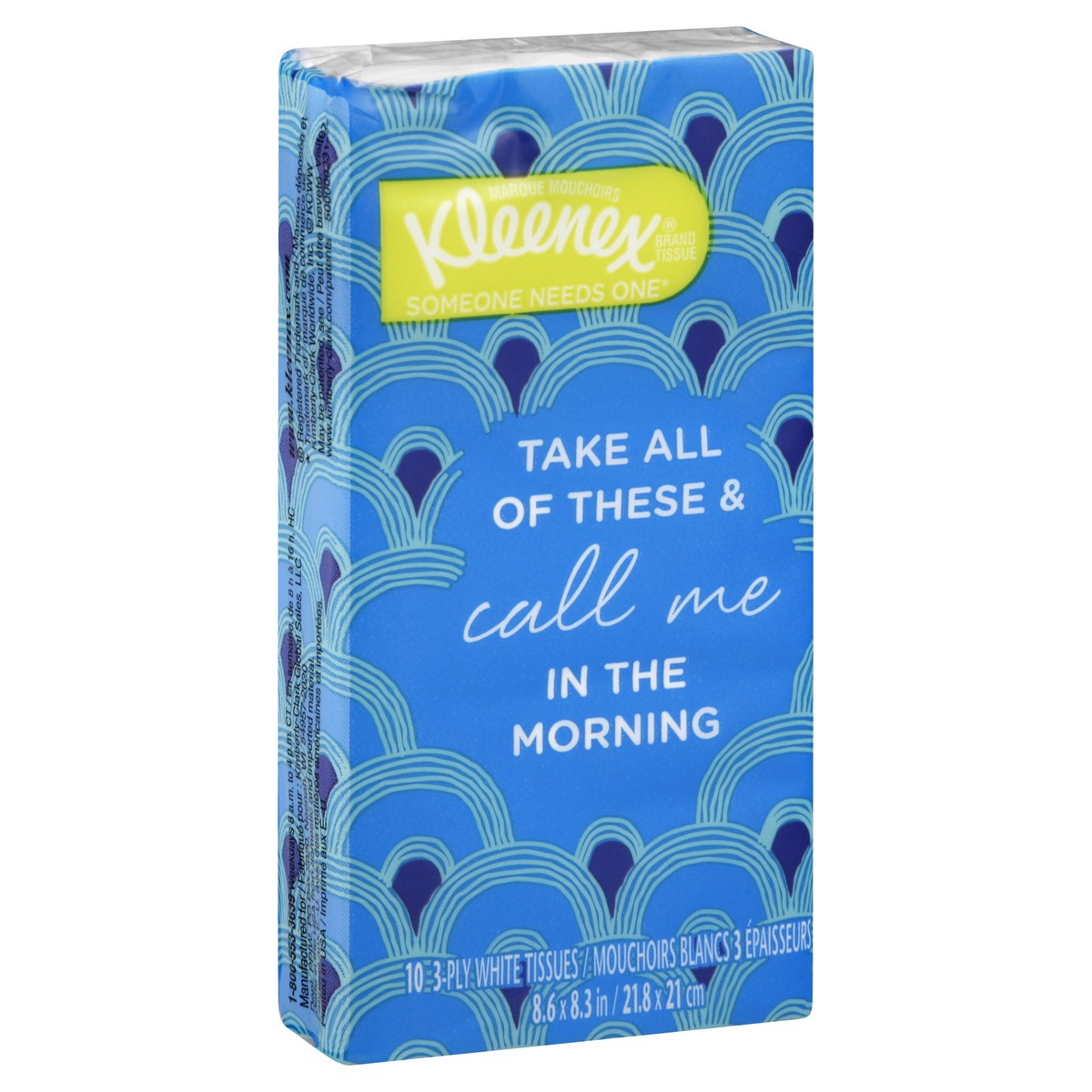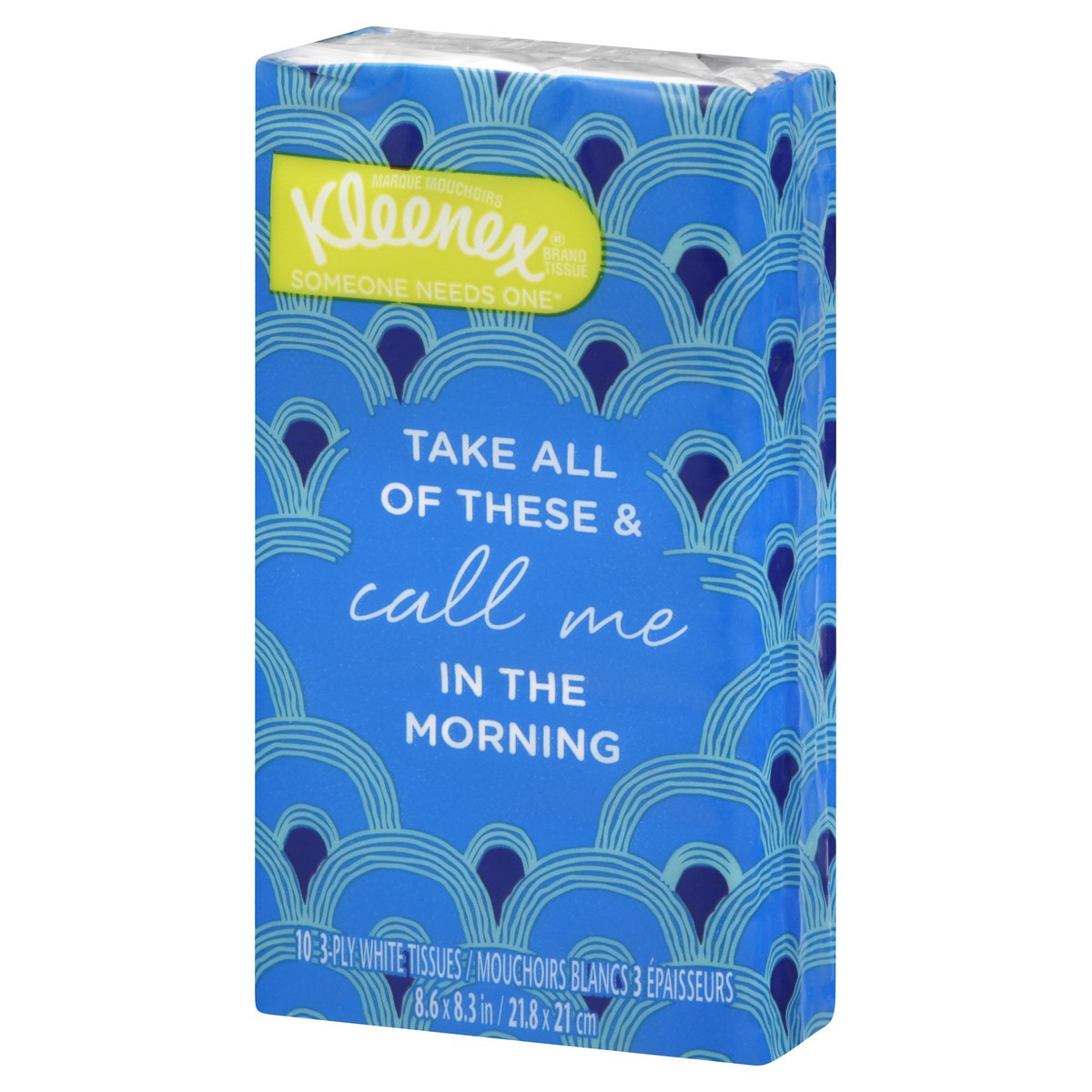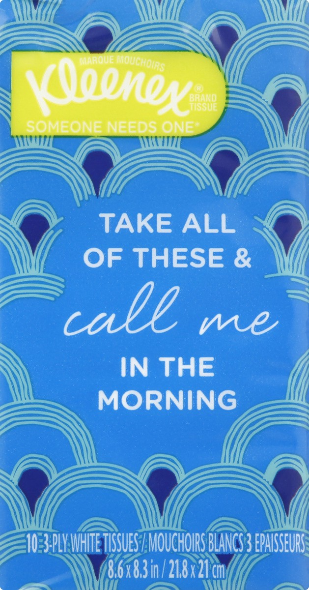 8.6 x 8.3 in (21.8 x 21 cm). 10 3-ply white tissues. Someone needs one. Take all of these & call me in the morning. www.kleenex.com (hashtag)sharekleenexcare. 1-800-553-3639 Weekdays 8am to 4pm CT. Ma…