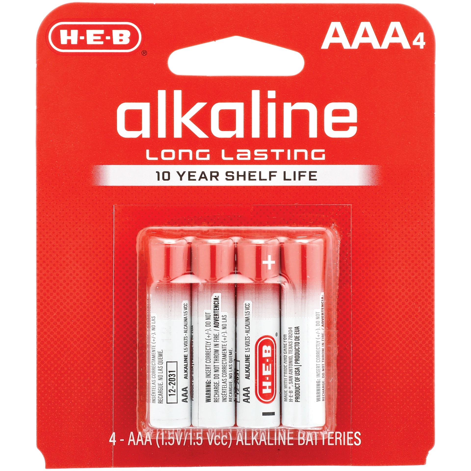 Our durable H-E-B AAA batteries hold power when you need it most for all your everyday devices.• 4 count Alkaline 1.5V AAA batteries• Long lasting• 10 year shelf life