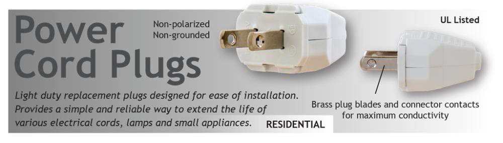 Designed for light duty plug replacement and repair. Made of impact-resistant thermoplastic for safety and durability. 15 amp non-polarized plug.