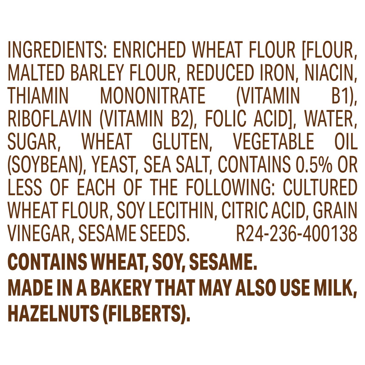 Enriched Wheat Flour [Flour, Malted Barley Flour, Reduced Iron, Niacin, Thiamin Mononitrate (Vitamin B1), Riboflavin (Vitamin B2), Folic Acid], Water, Sugar, Wheat Gluten, Vegetable Oil (Soybean), Yea…