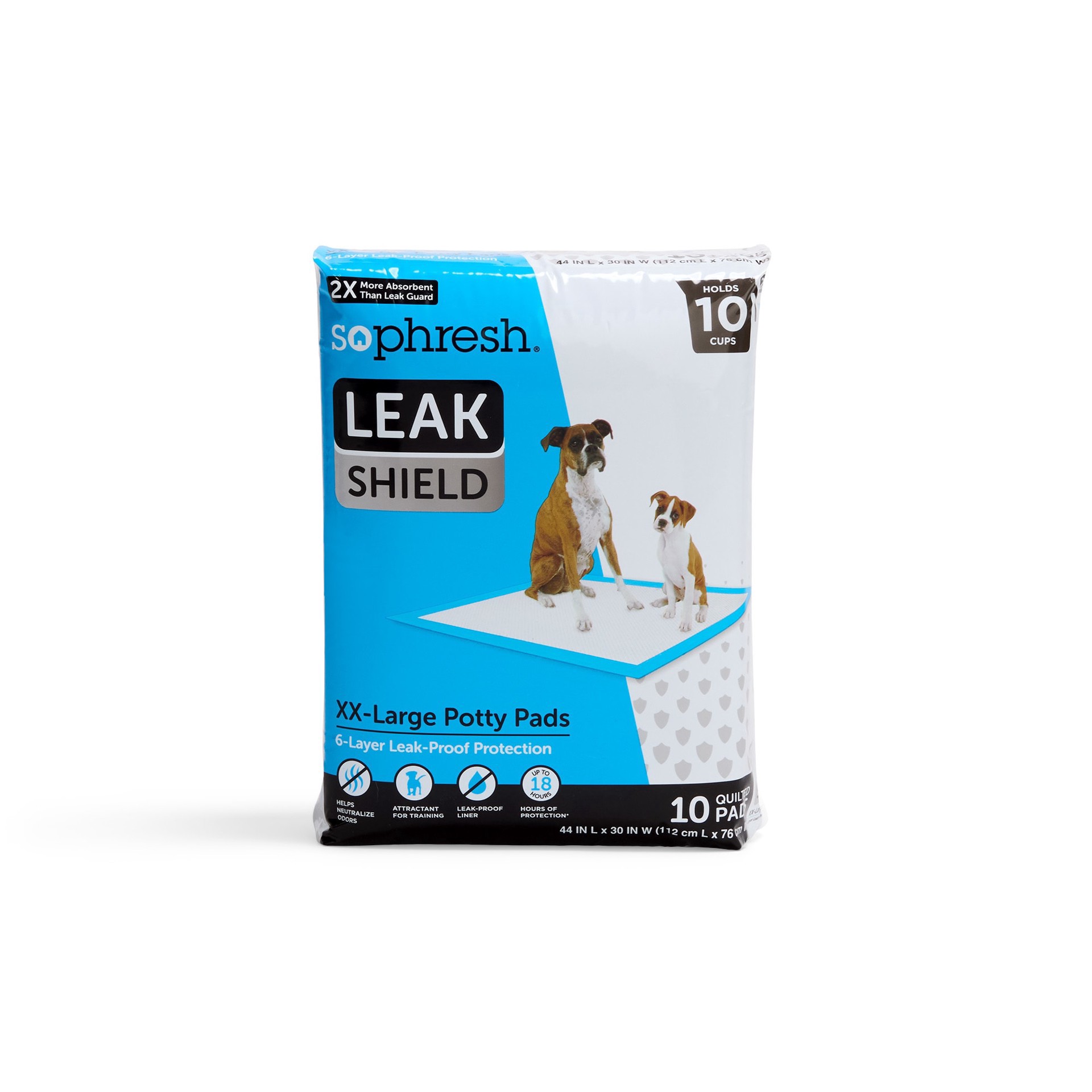 The So Phresh XX-Large Leak Shield Potty Pads soak up ten cups of liquid with proven leak protection, making them an ideal potty solution for pups in training or with limited access to an outdoor plac…