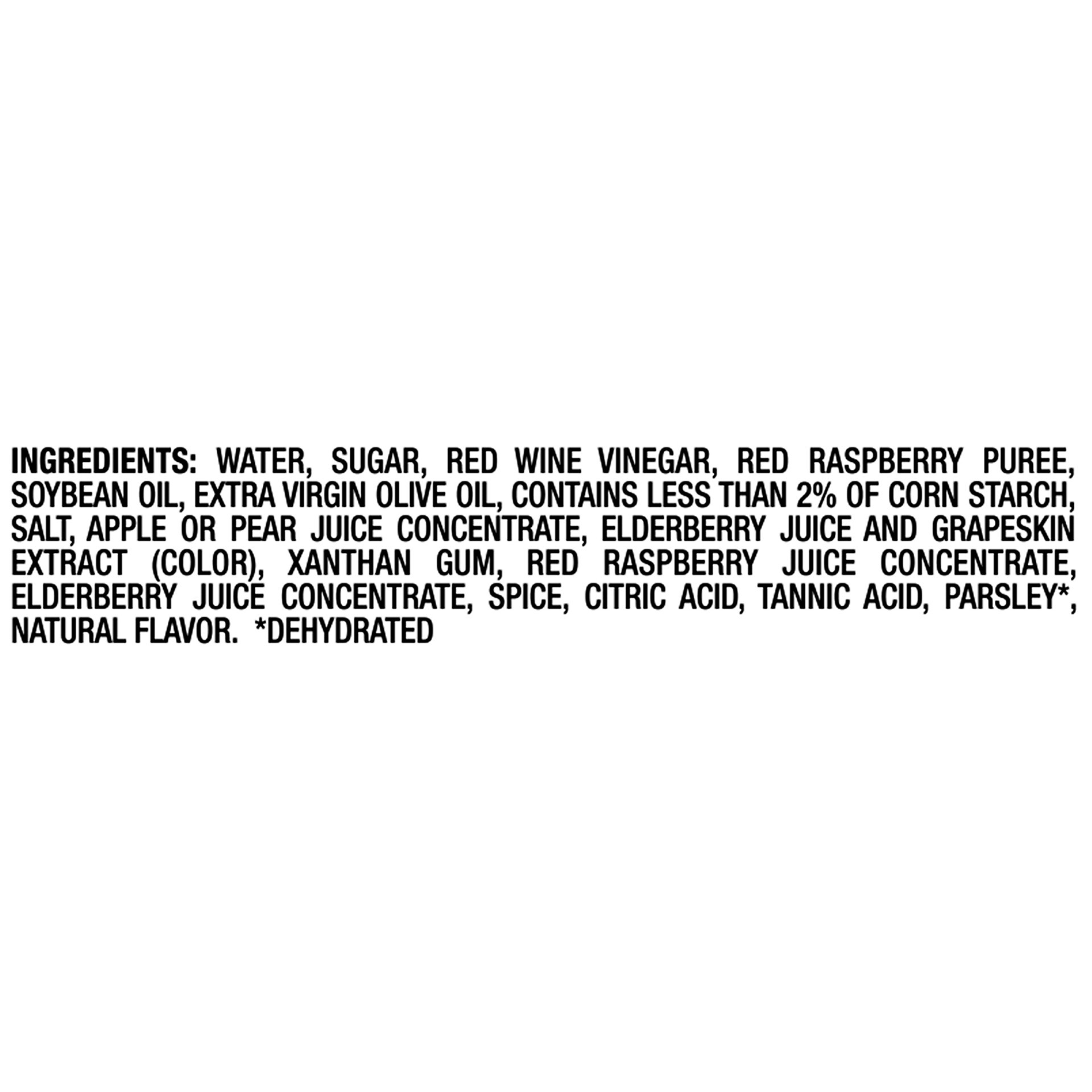 WATER, SUGAR, RED WINE VINEGAR, RED RASPBERRY PUREE, SOYBEAN OIL, EXTRA VIRGIN OLIVE OIL, CONTAINS LESS THAN 2% OF CORN STARCH, SALT, PEAR JUICE CONCENTRATE, XANTHAN GUM, ELDERBERRY JUICE CONCENTRATE …