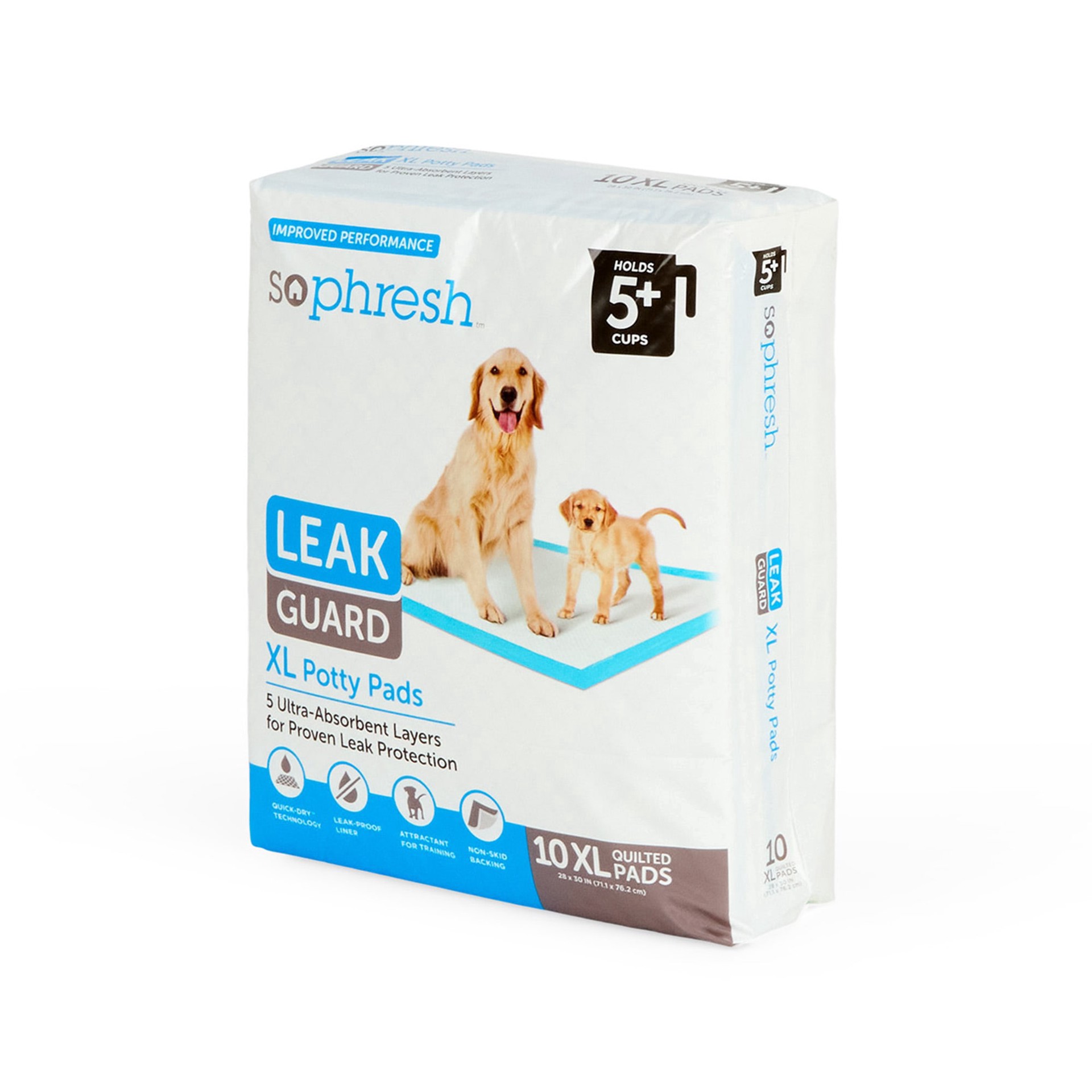The So Phresh X-Large Leak Guard Dog Pads soak up five cups of liquid with proven leak protection making them an ideal potty solution for pups in training or with limited access to an outdoor place wh…