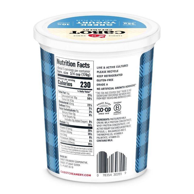 - Cabot Creamery Cabot Whole Milk Plain Greek Yogurt 2 lb (Refrigerated Tub)