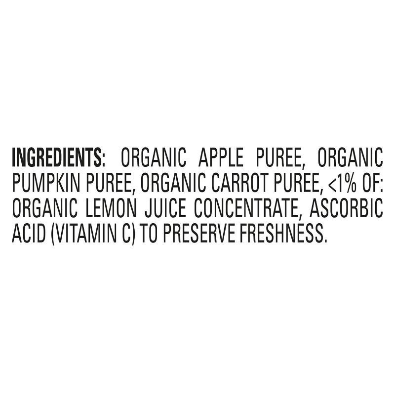 Organic Apple Puree, Organic Pumpkin Puree, Organic Carrot Puree, <1% of: Organic Lemon Juice Concentrate, Ascorbic Acid (Vitamin C) to Preserve Freshness.