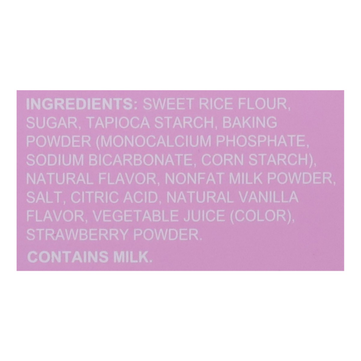 Sweet Rice Flour, Sugar, Tapioca Starch, Baking Powder (Monocalcium Phosphate, Sodium Bicarbonate, Corn Starch), Natural Flavor, Nonfat Milk Powder, Salt, Citric Acid, Natural Vanilla Flavor, Vegetabl…