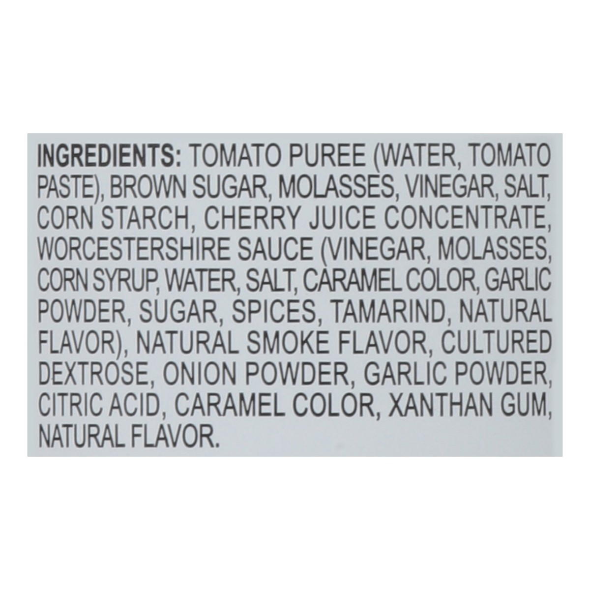 Tomato Puree (Water, Tomato Paste), Brown Sugar, Molasses, Vinegar, Salt, Corn Starch, Cherry Juice Concentrate, Worcestershire Sauce (Vinegar, Molasses, Corn Syrup, Water, Salt, Caramel Color, Garlic…