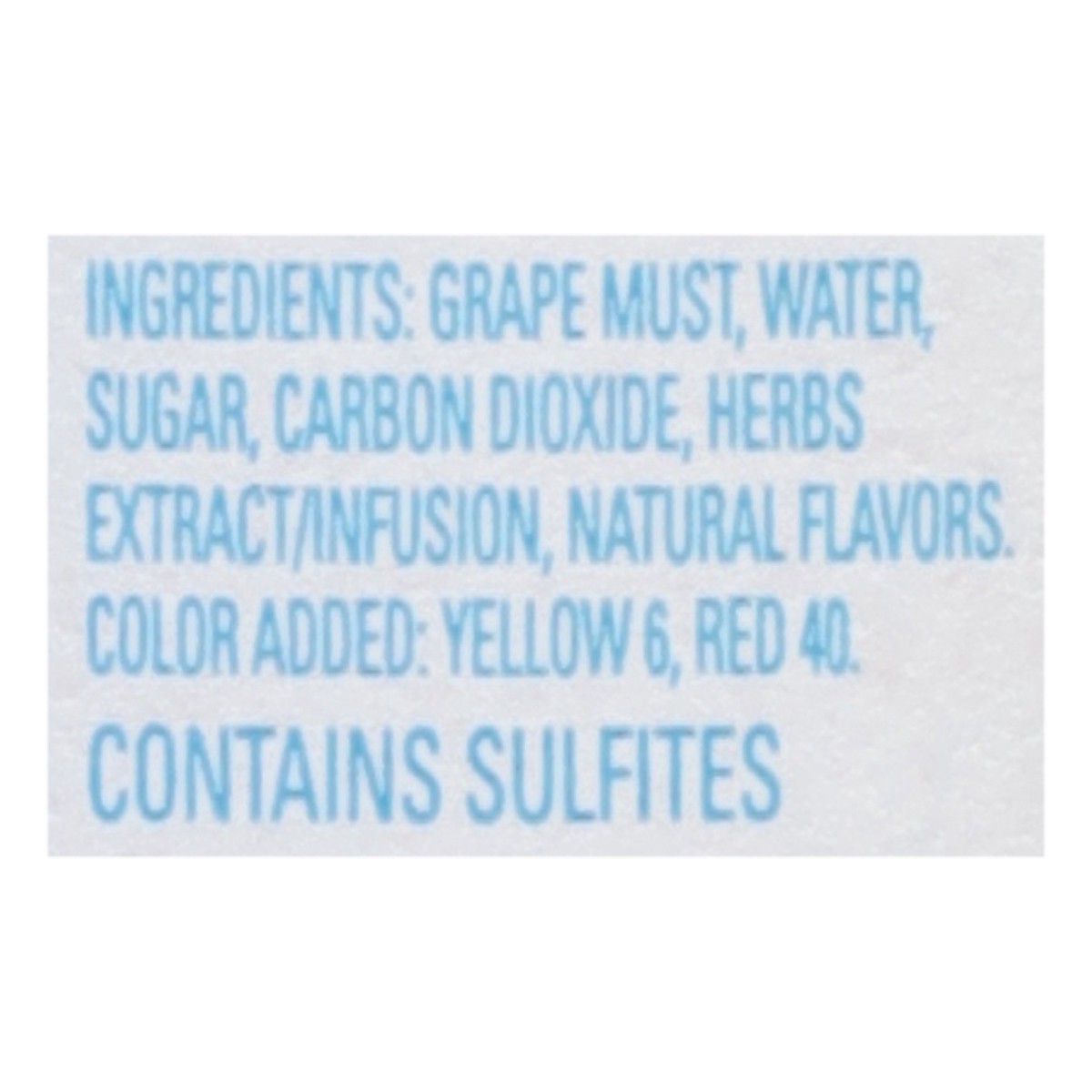 Grape Must, Water, Sugar, Carbon Dioxide, Herbs Extract/Infusion, Natural Flavors, Color Added: Yellow 6, Red 40.