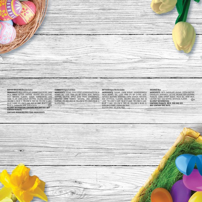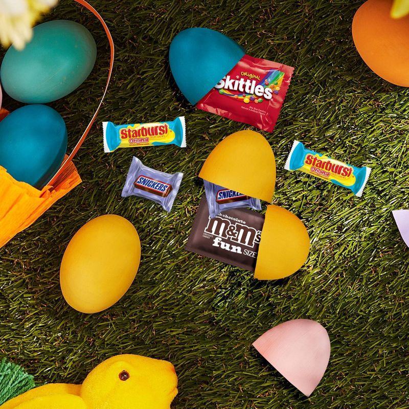 - This Egg Hunt essential includes fun size M&M'S Milk Chocolate, Candy, mini SNICKERS Chocolate Bars, fun size SKITTLES Original Chewy Candy, and fun size STARBURST Original Chewy Candy