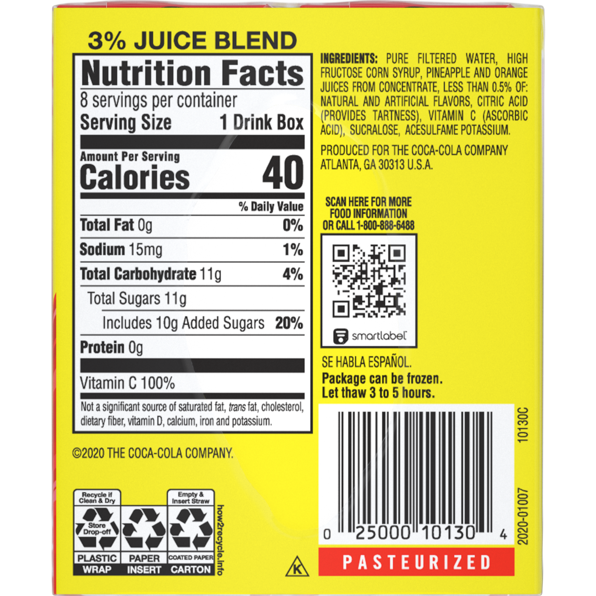 Pure Filtered Water, High Fructose Corn Syrup, Pineapple And Orange Juice From Concentrate, Less Than 0.5% Of: Natural And Artificial Flavors, Citric Acid (Provides Tartness), Vitamin C (Ascorbic Acid…