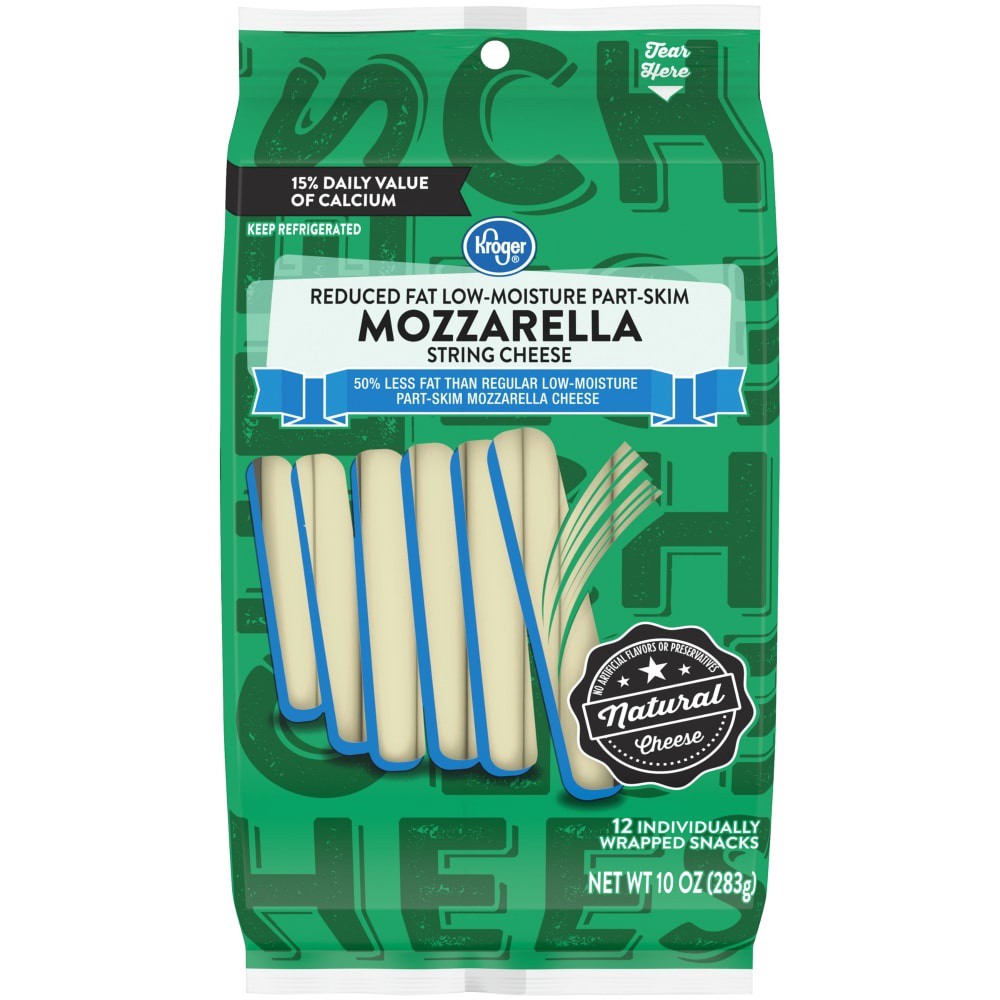 Kroger® Reduced Fat Mozzarella String Cheese gives you a delicious dairy delight. Made from pasteurized part-skim milk, cheese culture, enzymes, and salt, each stick is a promise of genuine flavor. Gr…