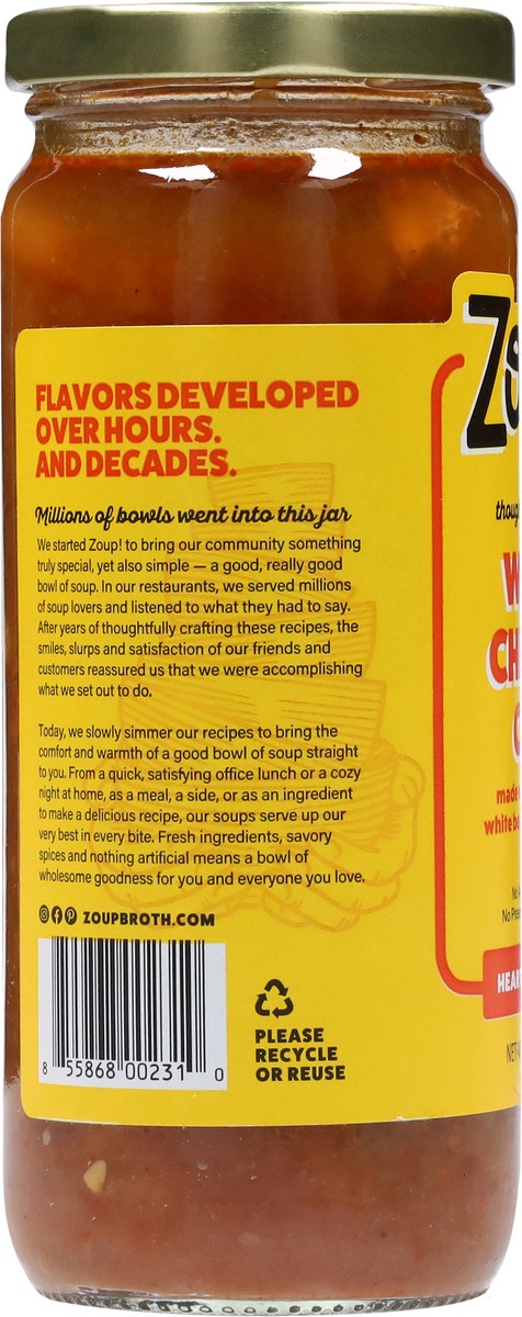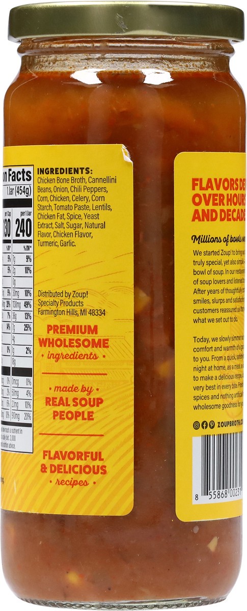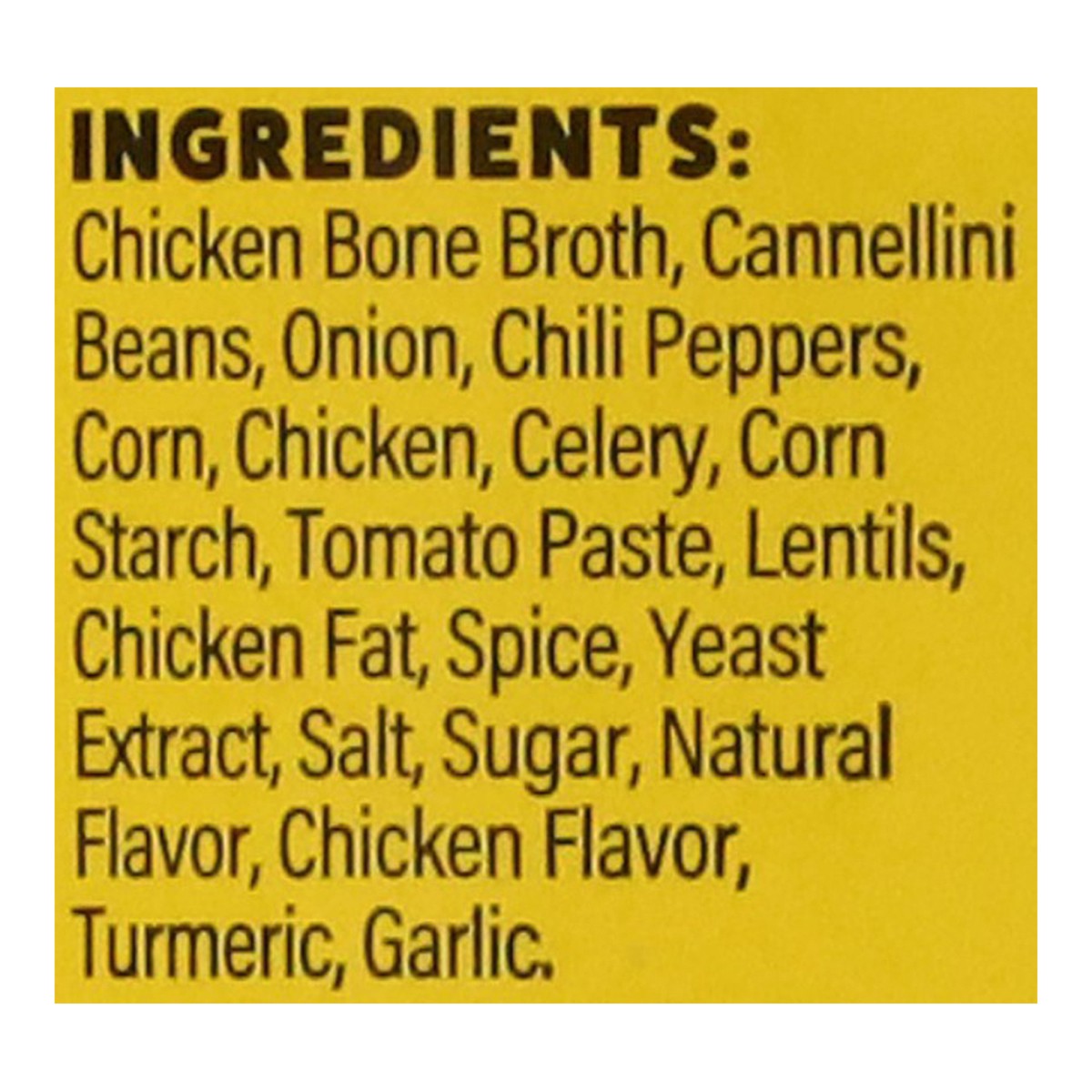Chicken Bone Broth, Cannellini Beans, Onion, Chili Peppers, Corn, Chicken, Celery, Corn Starch, Tomato Paste, Lentils, Chicken Fat, Spice, Yeast Extract, Salt, Sugar, Natural Flavor, Chicken Flavor, T…