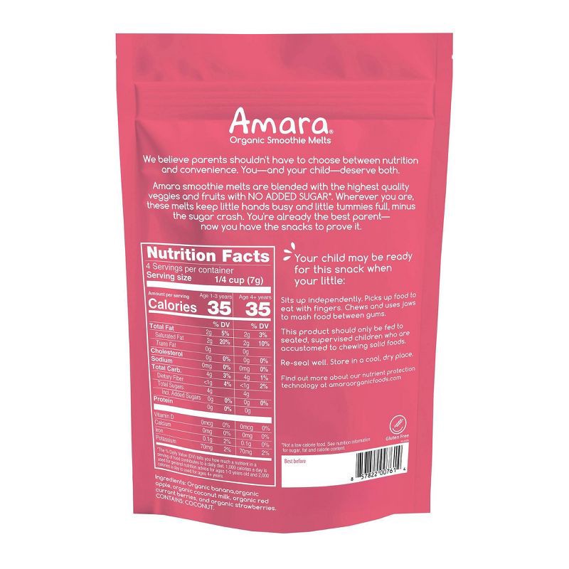 Amara Organic Smoothie Melts Mixed Red Berries Plant Based Yogurt Baby Snack - 1oz: 8 Months and Up, 3rd Stage, Pouch, Ready to Eat