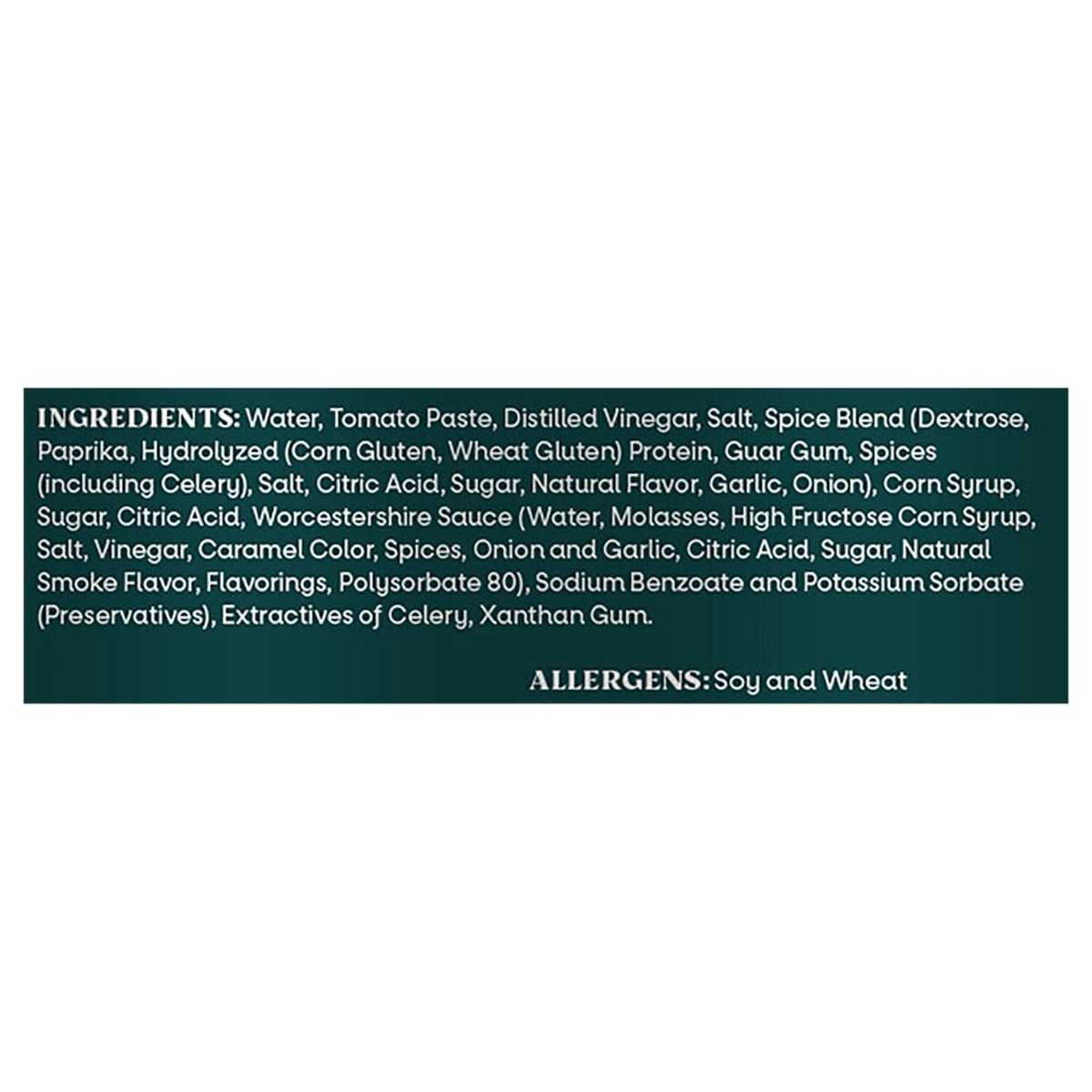 Water, Tomato Paste, Distilled Vinegar, Salt, Spice Blend (Dextrose, Paprika, Hydrolyzed (Corn Gluten, Wheat Gluten) Protein, Guar Gum, Spices (Including Celery), Salt, Citric Acid, Sugar, Natural Fla…