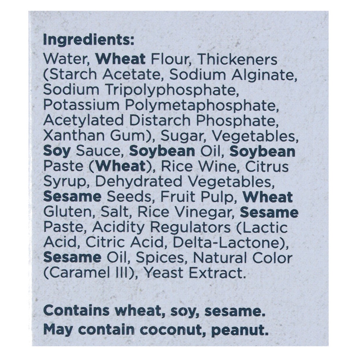Water, Wheat Flour, Thickeners (Starch Acetate, Sodium Alginate, Sodium Tripolyphosphate, Potassium Polymetaphosphate, Acetylated Distarch Phosphate, Xanthan Gum), Sugar, Vegetables, Soy Sauce, Soybea…