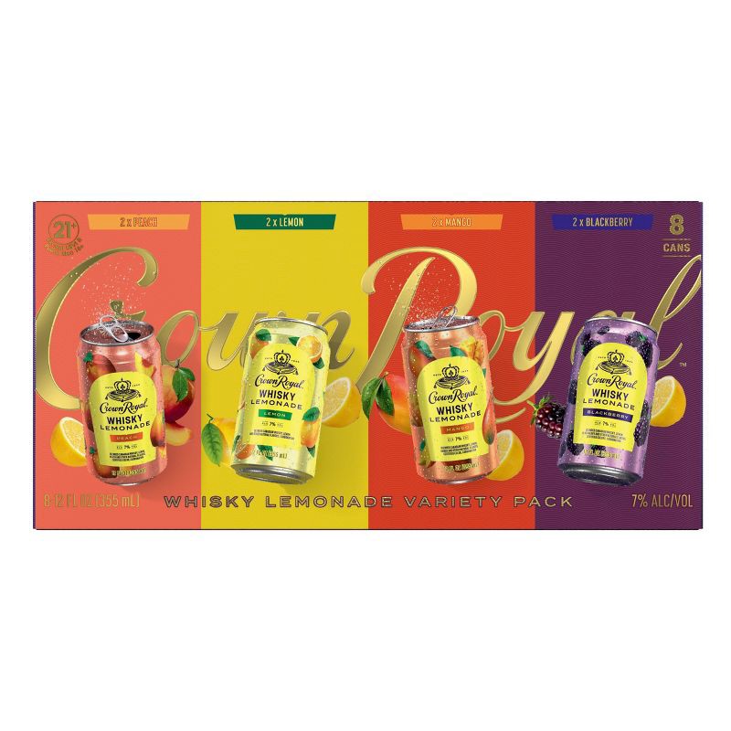 - Includes eight total 12 oz cans of Crown Royal Whisky Lemonade, Crown Royal Peach Lemonade, Crown Royal Blackberry Lemonade, and Crown Royal Mango LemonadeCrown Royal Ready-to-Drink (RTD) Whisky Lemonade was awarded a Gold Medal in 2023 at the San Francisco World Spirits Competition7% alc./vol.This variety pack includes four delicious flavors: Crown Royal Whisky Lemonade, Crown Royal Peach Lemonade, Crown Royal Blackberry Lemonade, and Crown Royal Mango LemonadePerfect as a convenient cocktail to bring to hangouts with friends or to pack in the cooler for a day in the sunSimply pour in a glass with ice or serve chilledFeatures the smooth taste of traditional Crown Royal Whisky in each canned cocktail flavor
