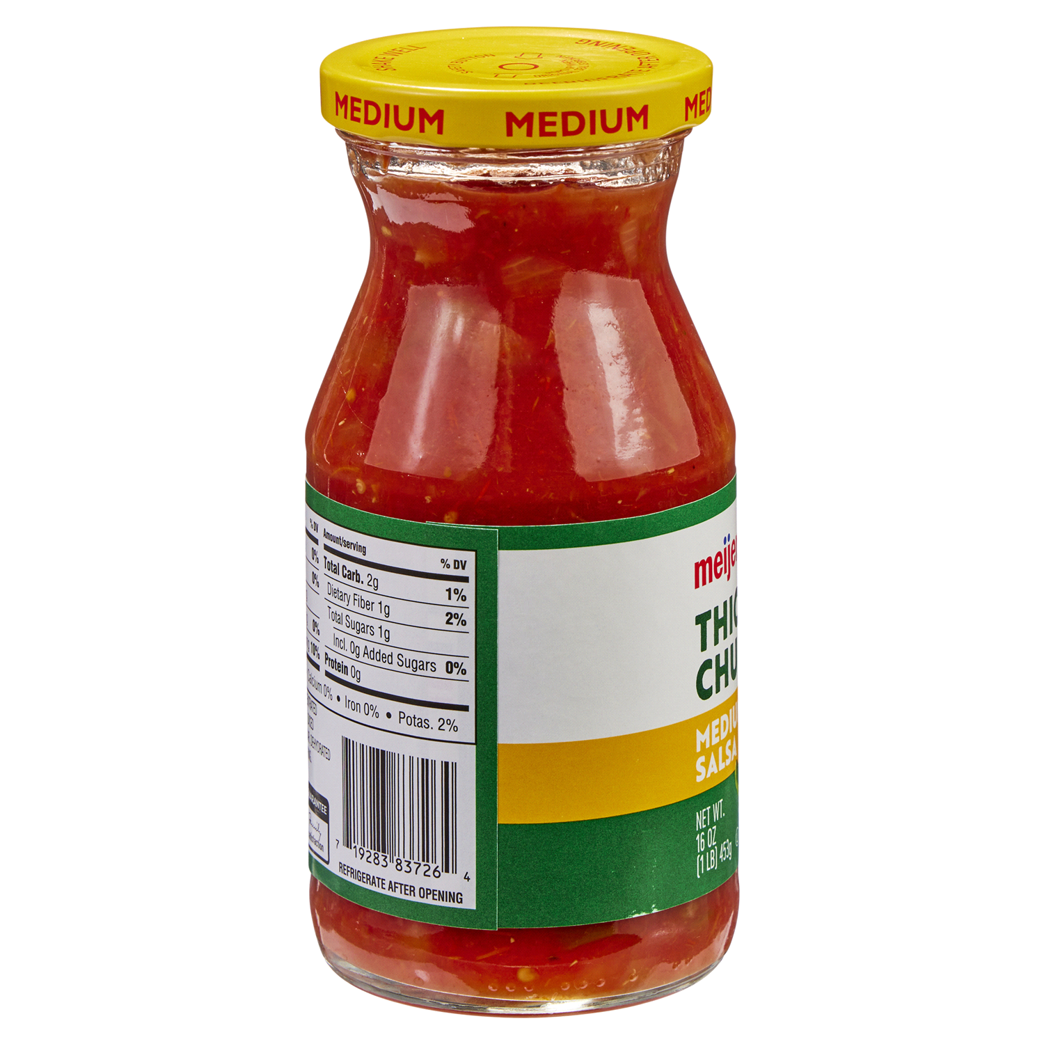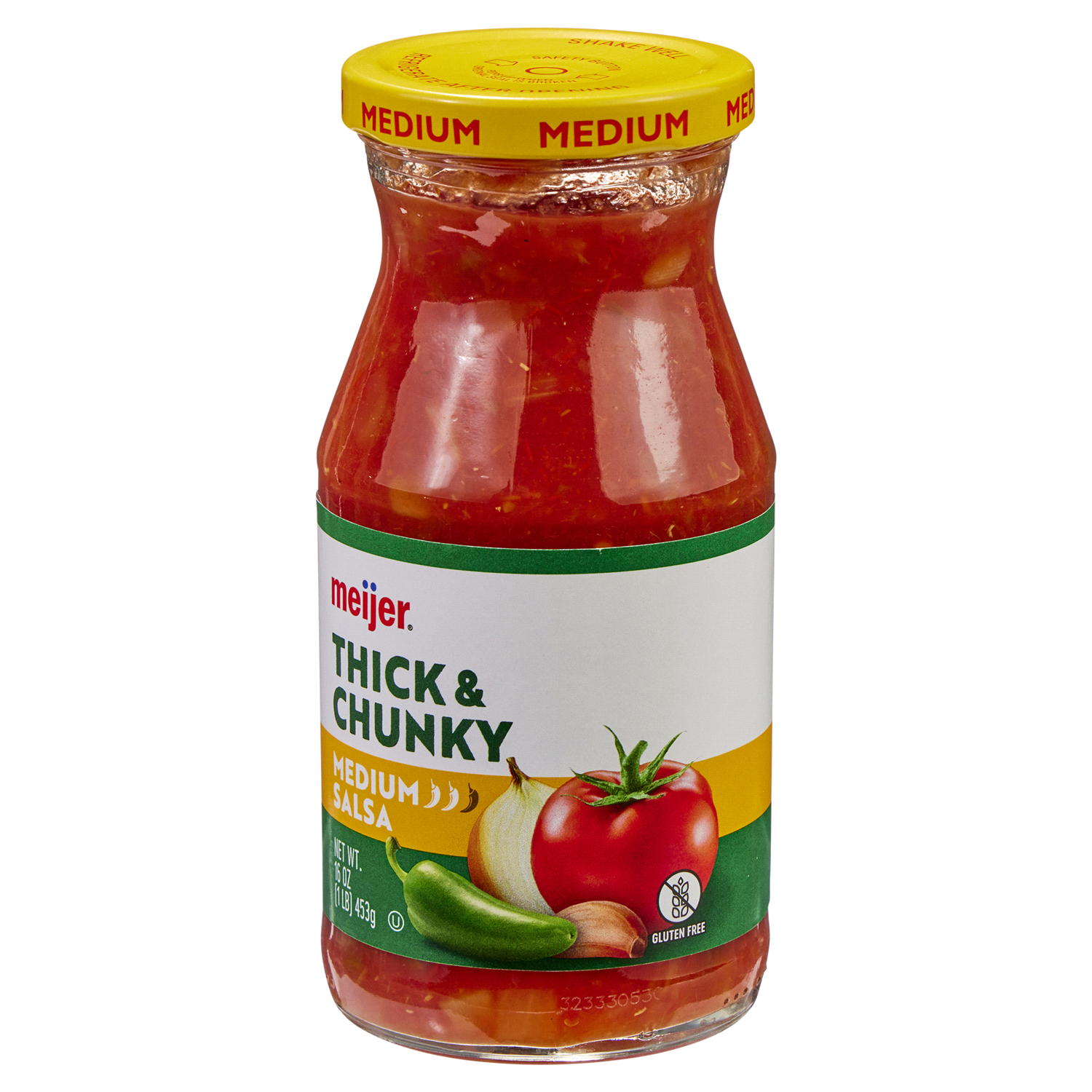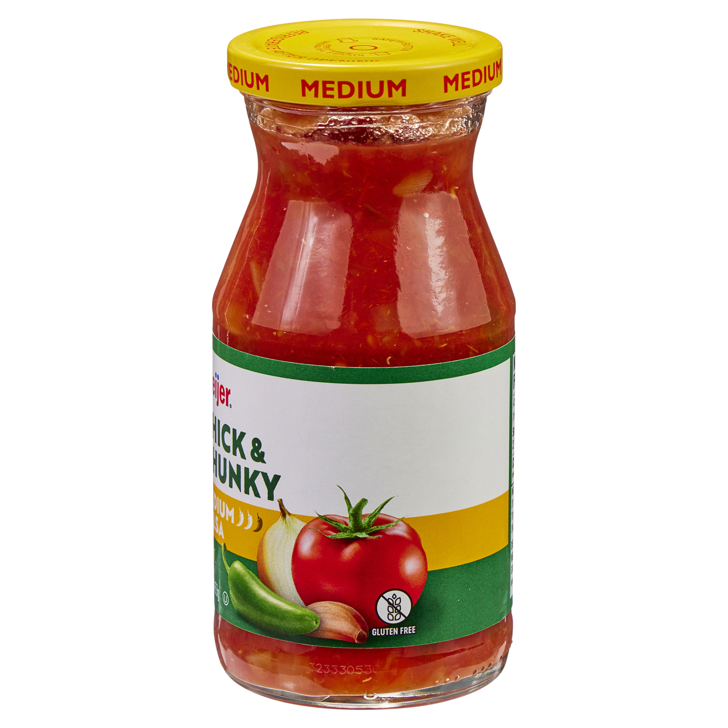 Savor the robust blend of Meijer Thick & Chunky Medium Salsa, crafted with crushed tomatoes, onions, and jalapeno peppers. This gluten-free, medium-heat salsa adds a flavorful punch to your dishes.