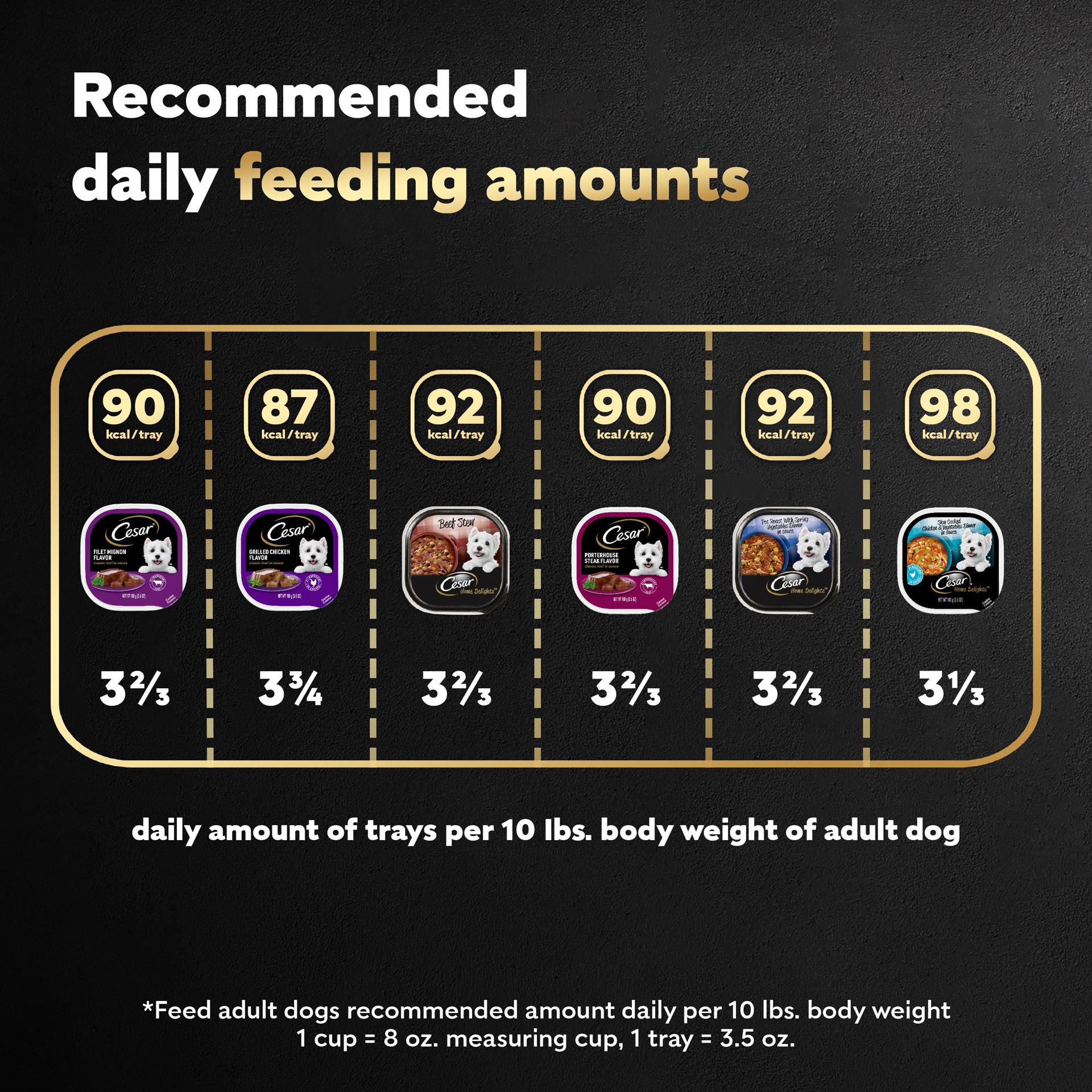 Calorie Content (Calculated): 917 kcal ME/kg, 92 kcal ME/tray. Cesar Canine Cuisine is formulated to meet the nutritional levels established by the AAFCO Dog Food Nutrient Profiles for maintenance. Ca…