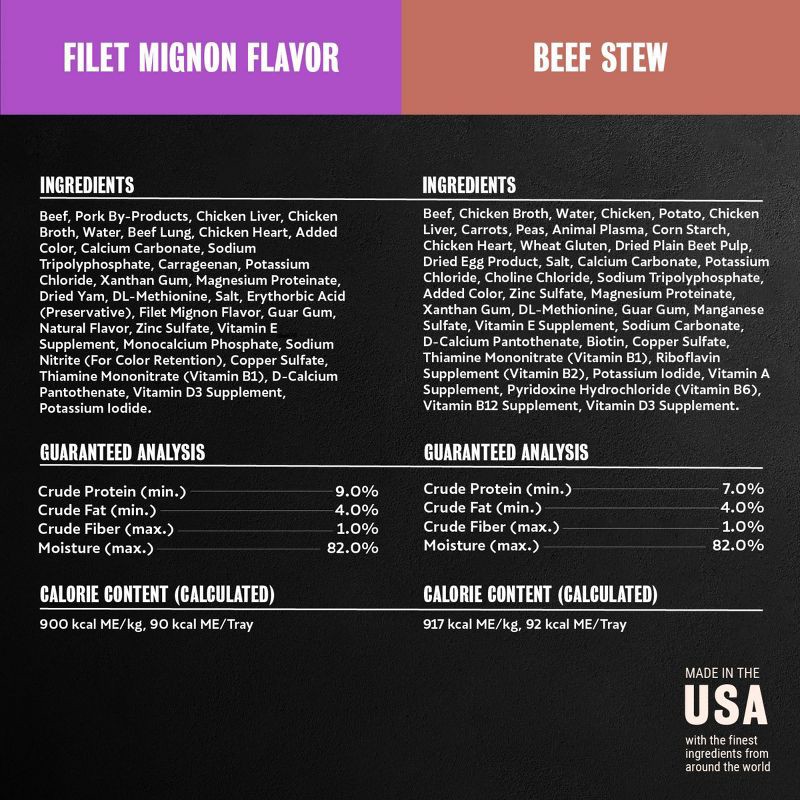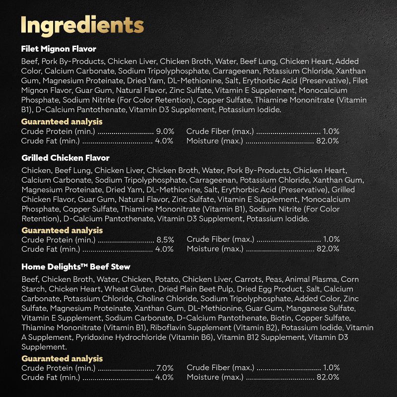 Cesar Classic Loaf in Sauce Filet Mignon Flavor: Beef, Pork By-Products, Chicken Liver, Chicken Broth, Water, Beef Lung, Chicken Heart, Added Color, Calcium Carbonate, Sodium Tripolyphosphate, Carrage…