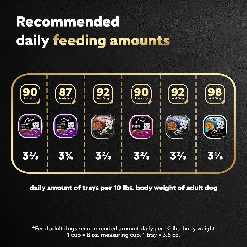 - Variety Pack: Contains twenty-four (24) 3.5 oz. trays of Cesar Wet Dog Food Home Delights & Classic Loaf in Sauce Variety Pack: (6) Beef Stew, (6) Slow Cooked Chicken & Vegetable Dinner, (6) Pot Roast with Spring Vegetables Dinner, (6) Filet Mignon Flavor, (6) Porterhouse Steak Flavor, and (6) Grilled Chicken Flavor.