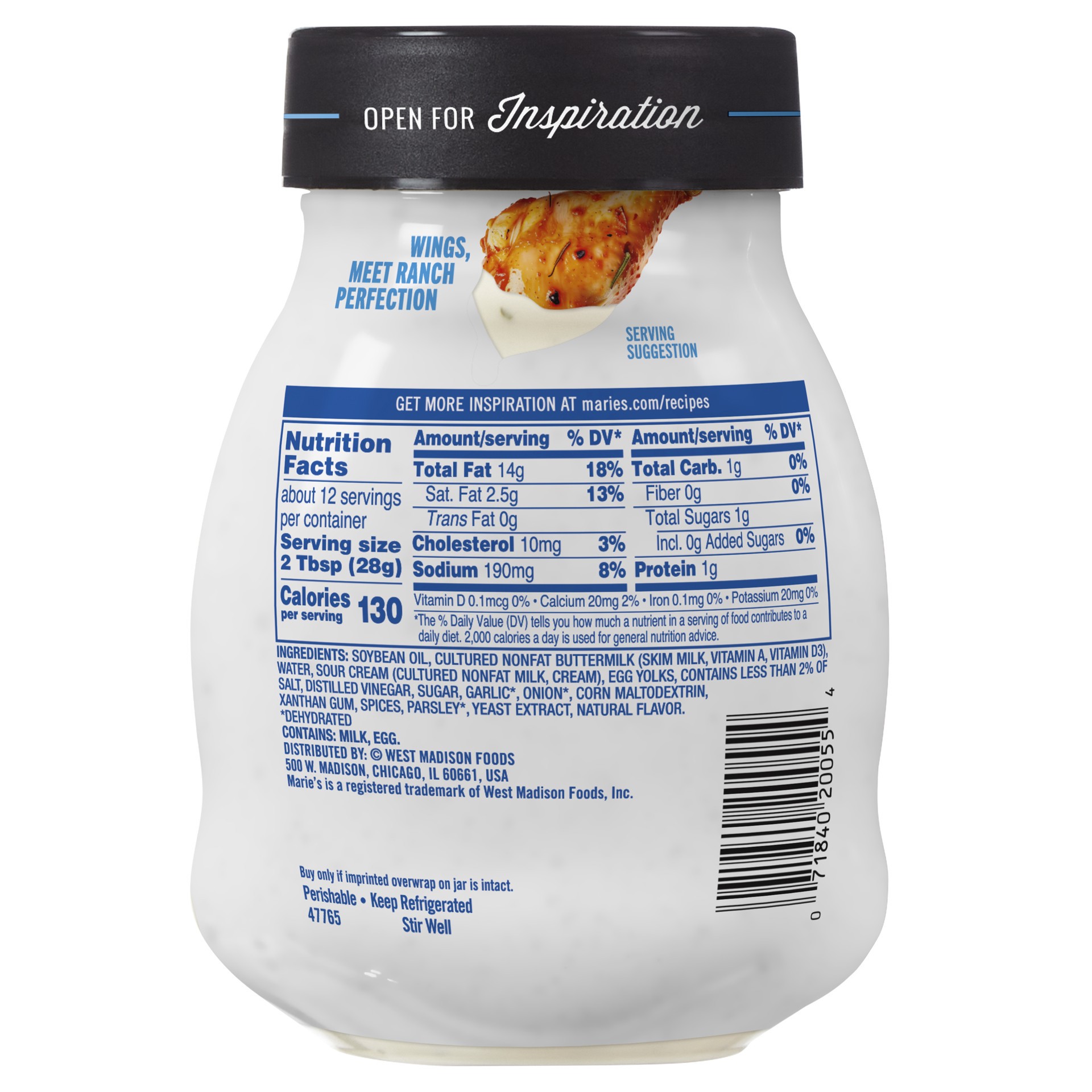 Marie's Classic Ranch dressing is the perfect blend of buttermilk, onion and herbs, bringing the creamy taste you know and love to salads, sandwiches, and snacks. Whether you're dipping veggies, sprea…