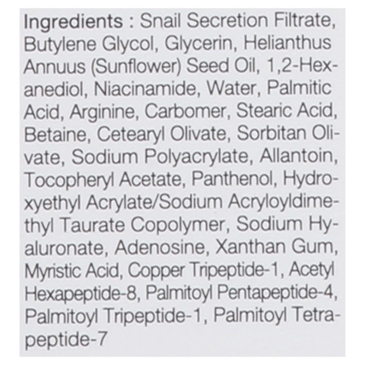 Snail Secretion Filtrate, Butylene Glycol, Glycerin, Helianthus Annuus (Sunflower) Seed Oil, 1, 2-Hex-Anediol, Niacinamide, Water, Palmitic Acid, Arginine, Carbomer, Stearic Acid, Betaine, Cetearyl Ol…