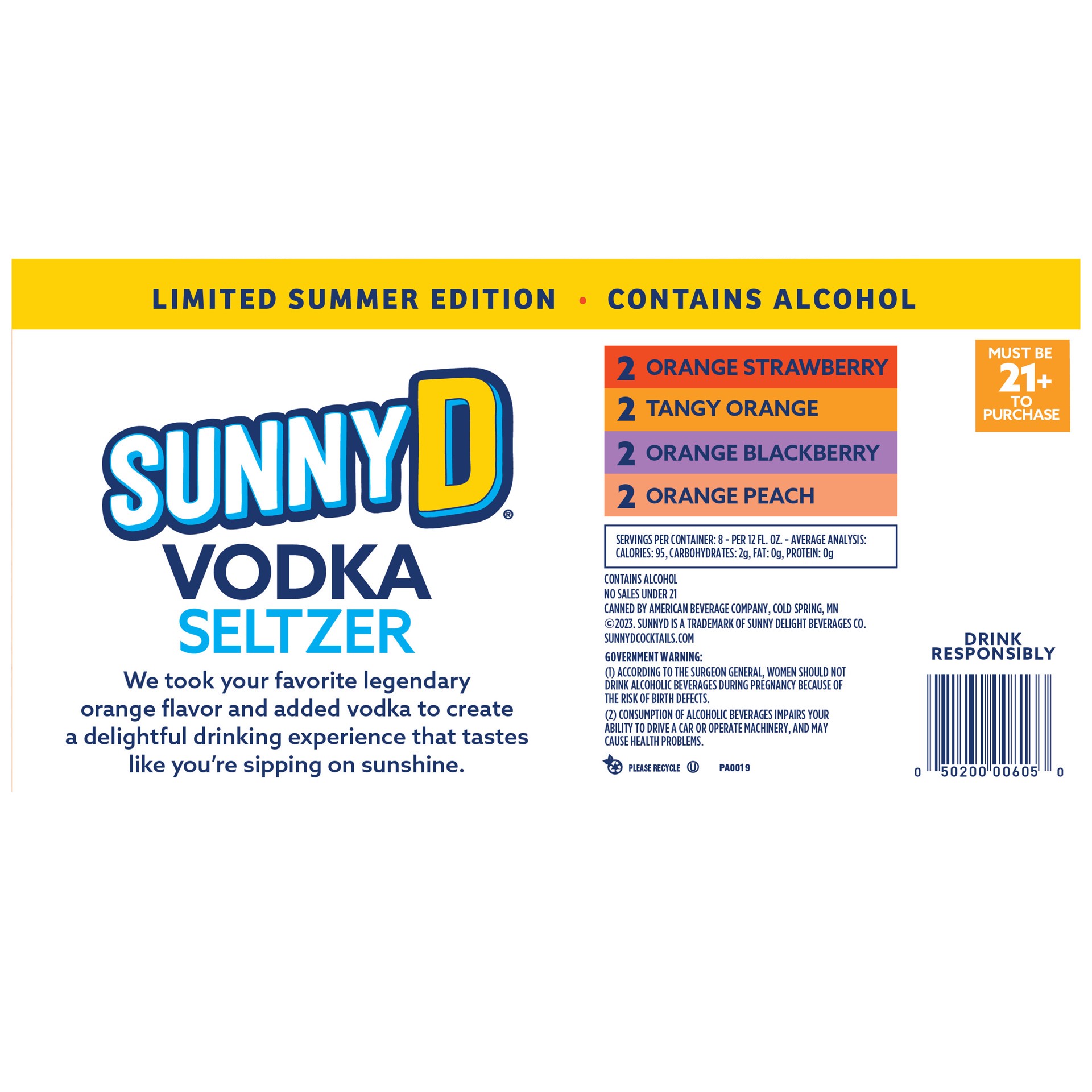 Experience the one-of-a-kind flavor of SUNNYD, now with vodka—SUNNYD Vodka Seltzer! This limited time Summer variety pack features summer inspired favorites like Tangy Orange, Orange Strawberry Orange…