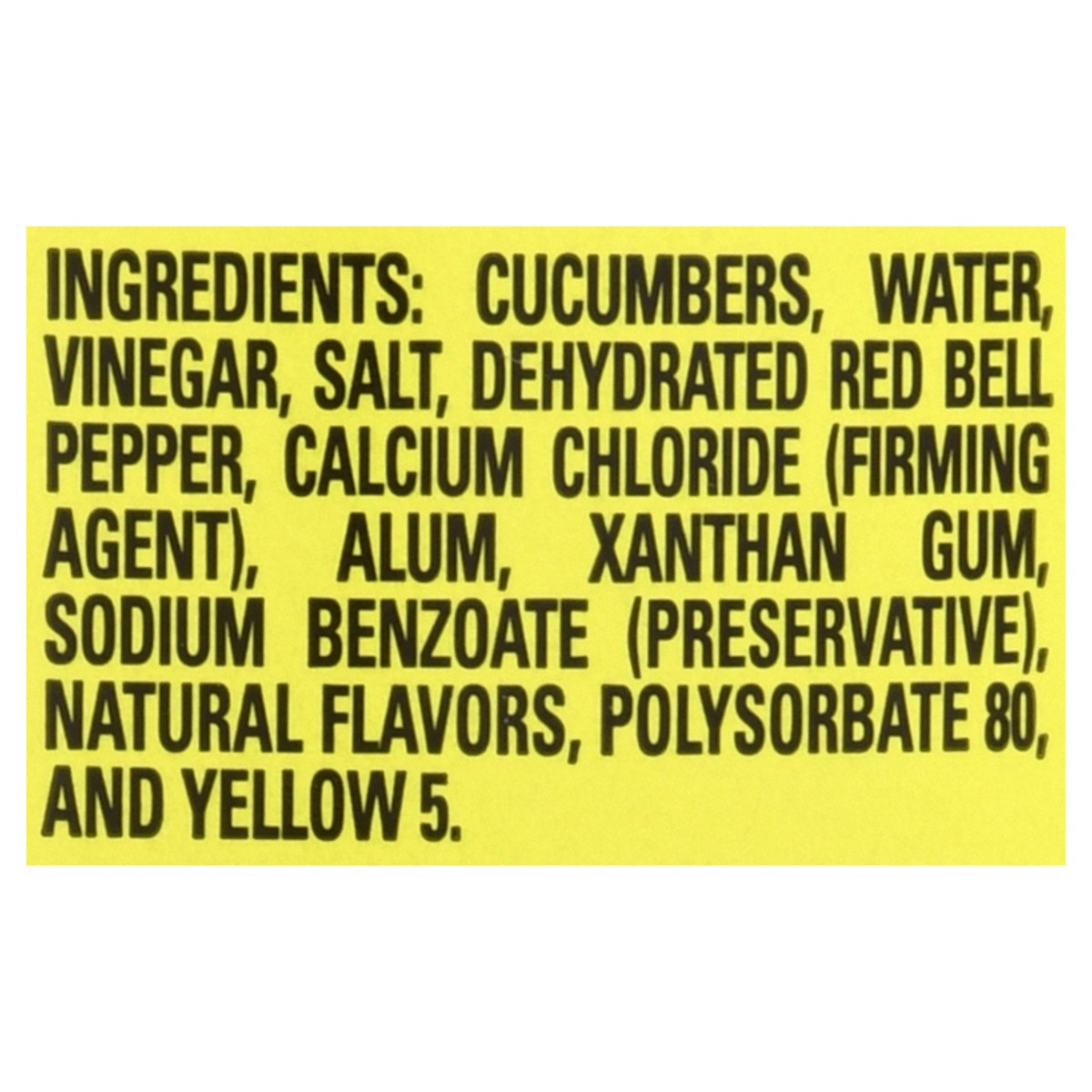 Cucumbers, Water, Vinegar, Salt, Dehydrated Red Bell Pepper, Calcium Chloride (Firming Agent), Alum, Xanthan Gum, Sodium Benzoate (Preservative), Natural Flavors, and Turmeric (for Color).