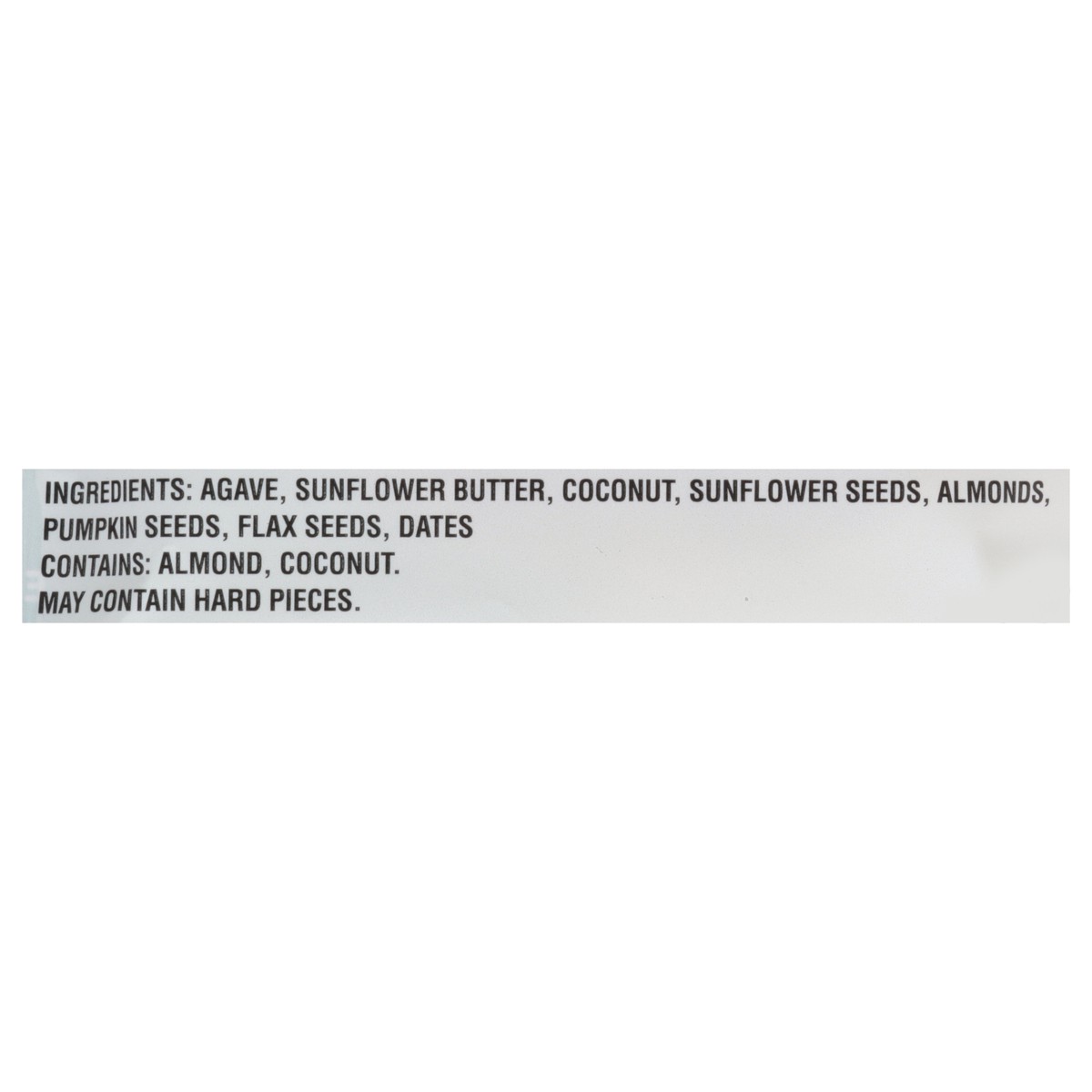 Agave, Sunflower Butter, Coconut, Sunflower Seeds, Almonds, Pumpkin Seeds, Flax Seeds, Dates.
