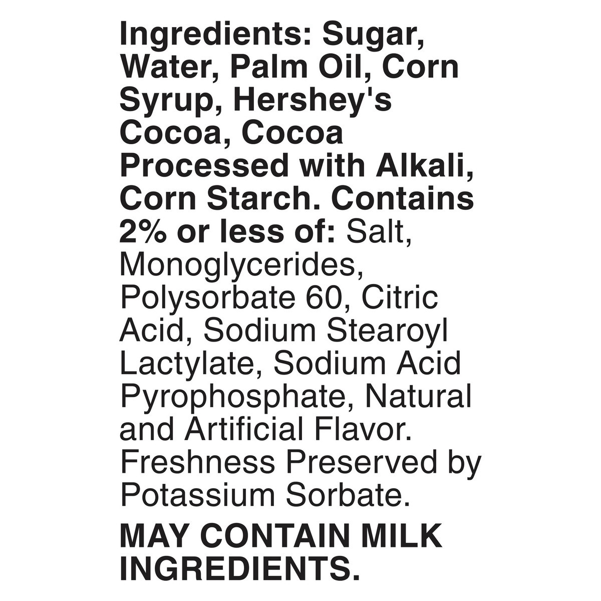Sugar, Water, Palm Oil, Corn Syrup, Hershey's Cocoa, Cocoa Processed with Alkali, Corn Starch, Contains 2% or Less of: Salt, Monoglycerides, Polysorbate 60, Citric Acid, Sodium Stearoyl Lactylate, Sod…