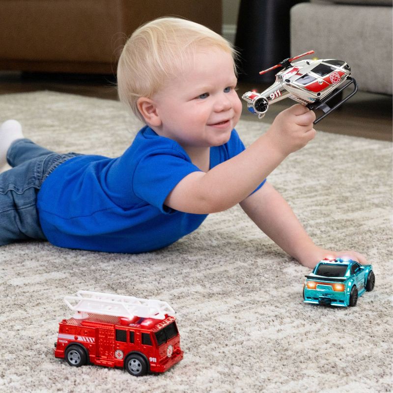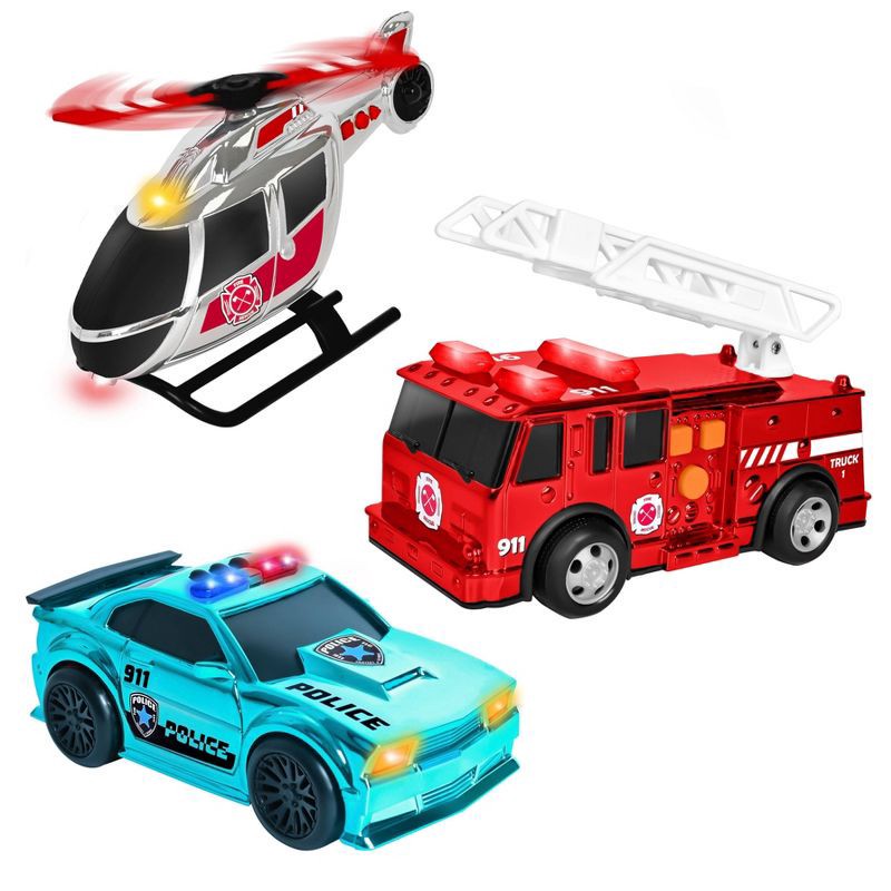 - 3 VEHICLES: Ignite your child's imagination with the firetruck, police car, and helicopter, all with a dazzling chrome finish that makes every adventure shine.