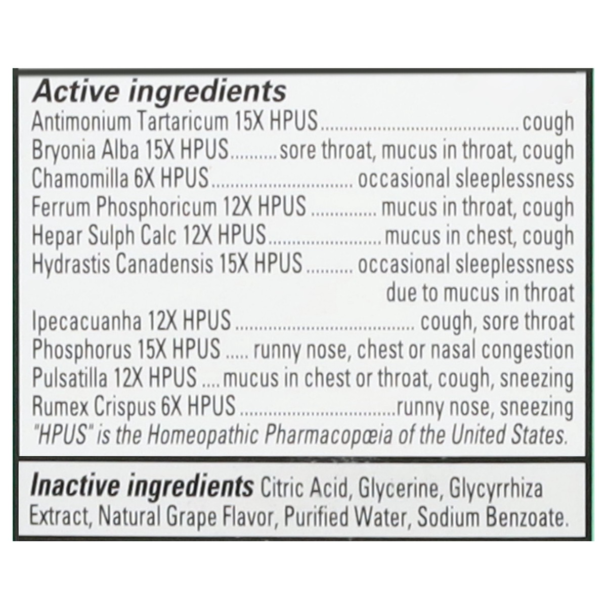 Active Ingredients: Antimonium Tartaricum 15X HPUS, Cough; Bryonia Alba 15X HPUS, Sore Throat, Mucus in Throat, Cough; Chamomilla 6X HPUS, Occasional Sleeplessness; Ferrum Phosphoricum 12X HPUS, Mucus…