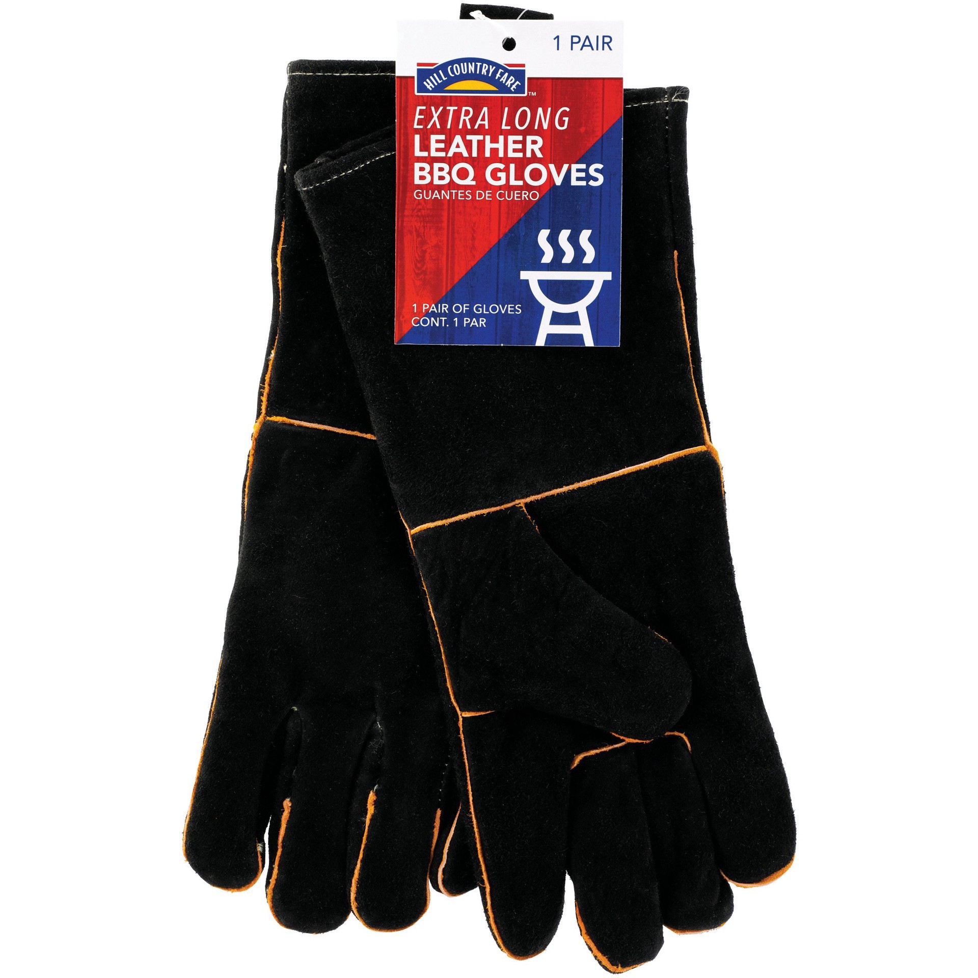 Protect your bare hands and wrist area from the heat with Hill Country Fare Extra Long Leather BBQ Gloves. The soft pliable leather gives you the upper hand when handling hot food coming off the grill…