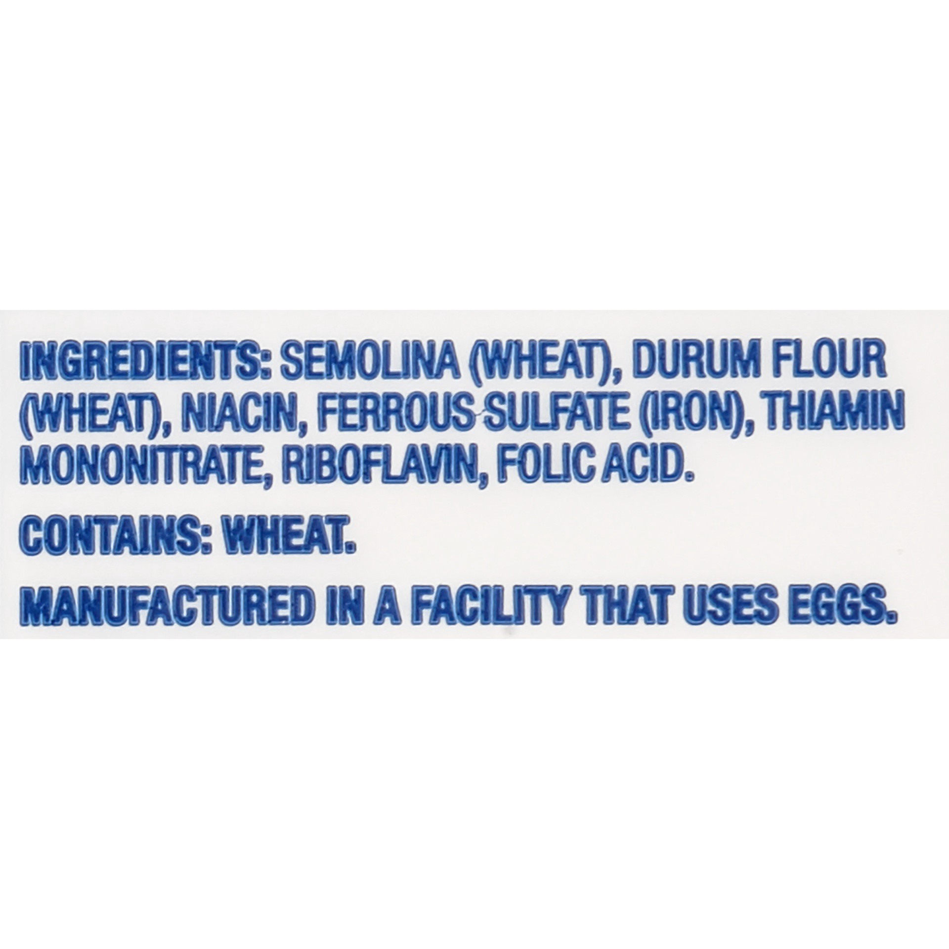 Semolina !(Wheat), Durum Flour !(Wheat), Niacin, Ferrous Sulfate !(Iron), Thiamin Mononitrate, Riboflavin, Folic Acid.