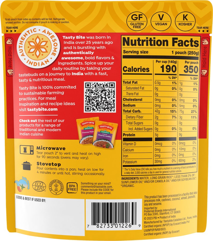 Restaurant-style steamed white rice. USDA Organic. Gluten free. Vegan. Certified Organic by Ecocert India PVT, LTD. Non GMO Project verified. nongmoproject.org. Microwavable 90 seconds. Kosher Inspect…