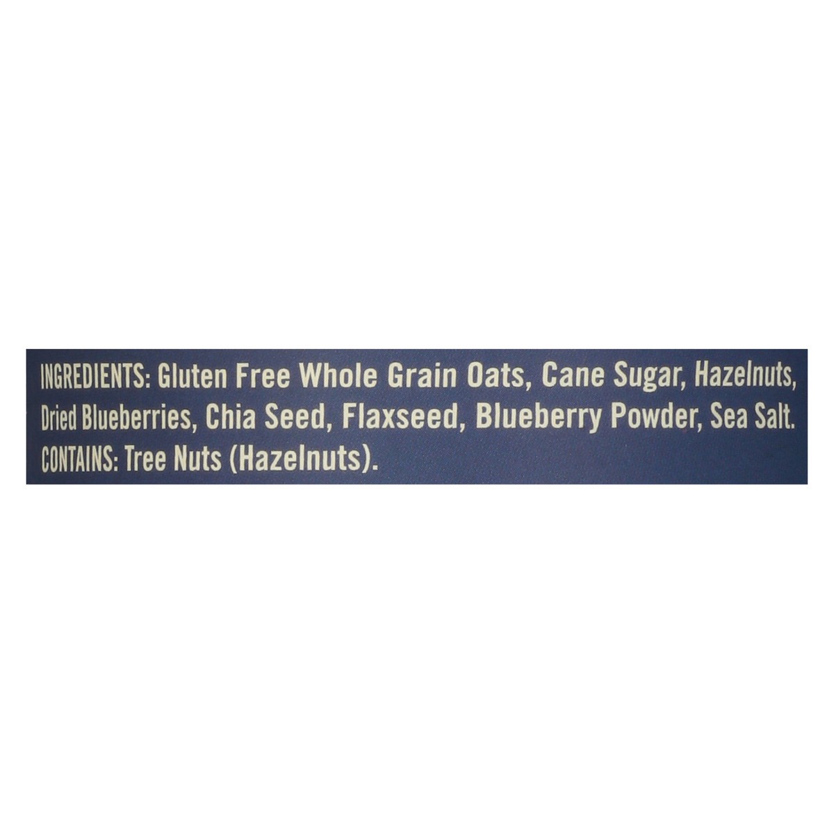Gluten Free Whole Grain Oats, Cane Sugar, Hazelnuts, Dried Blueberries, Chia Seed, Flaxseed, Blueberry Powder, Sea Salt.