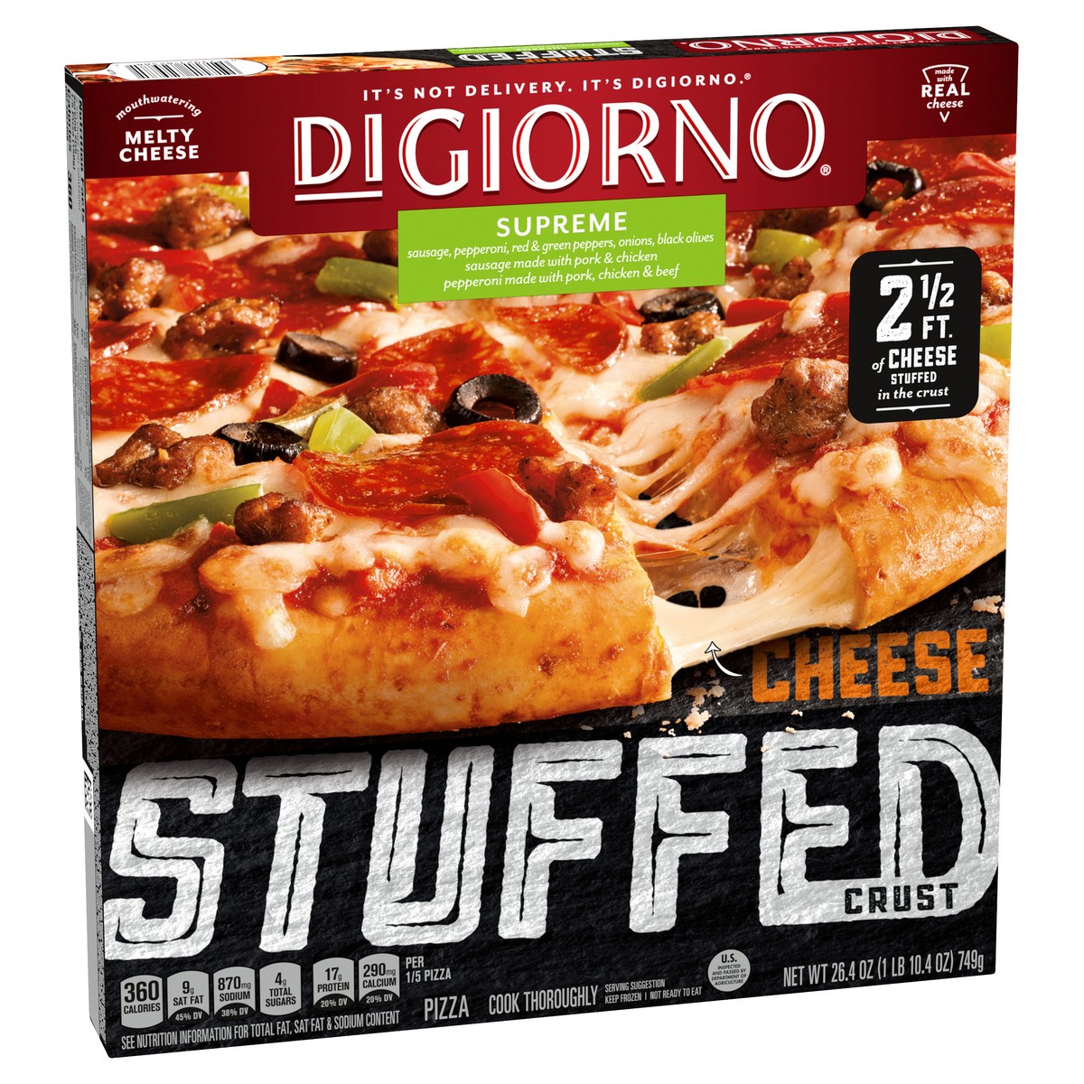 DiGiorno Supreme Frozen Pizza on a Cheese Stuffed Crust is created to bake up golden brown on the outside with 2 1/2 feet of mouthwatering, melty cheese stuffed in the crust. This frozen DiGiorno chee…