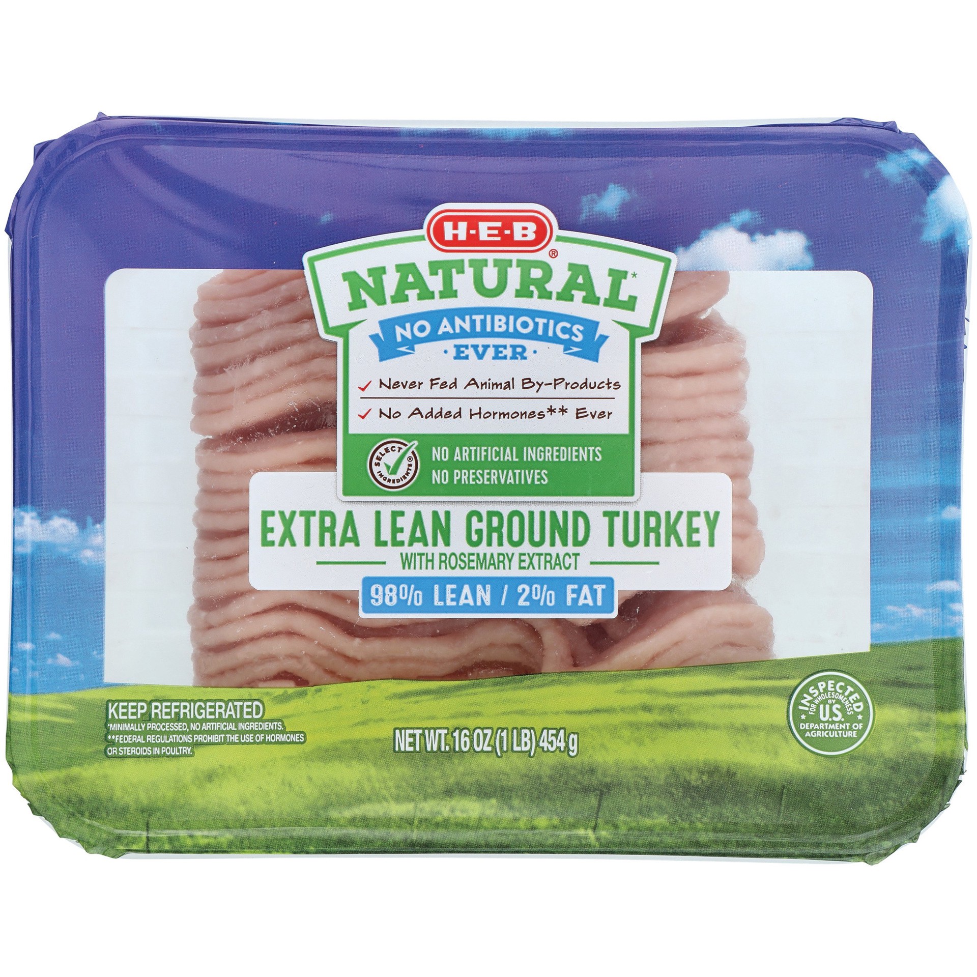 Extra lean with a ratio of 98% lean/2% fat, this H-E-B ground turkey breast is a great choice for making turkey burgers, meatballs or chili. Seasoned with rosemary, it's sourced from vegetarian-fed tu…