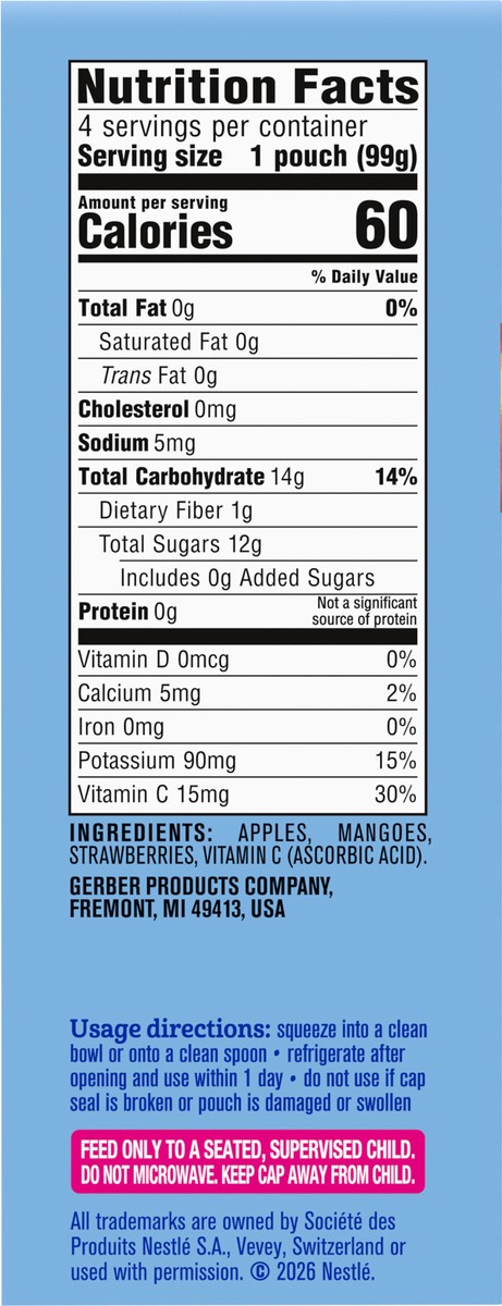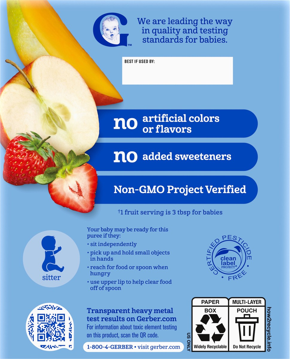 • CONVENIENT BABY FOOD: Our Gerber Apple Mango Strawberry Puree Pouch is designed for ease and convenience. This Gerber baby food multipack 4-count is portable, re-closeable and easy-to-store, for bus…