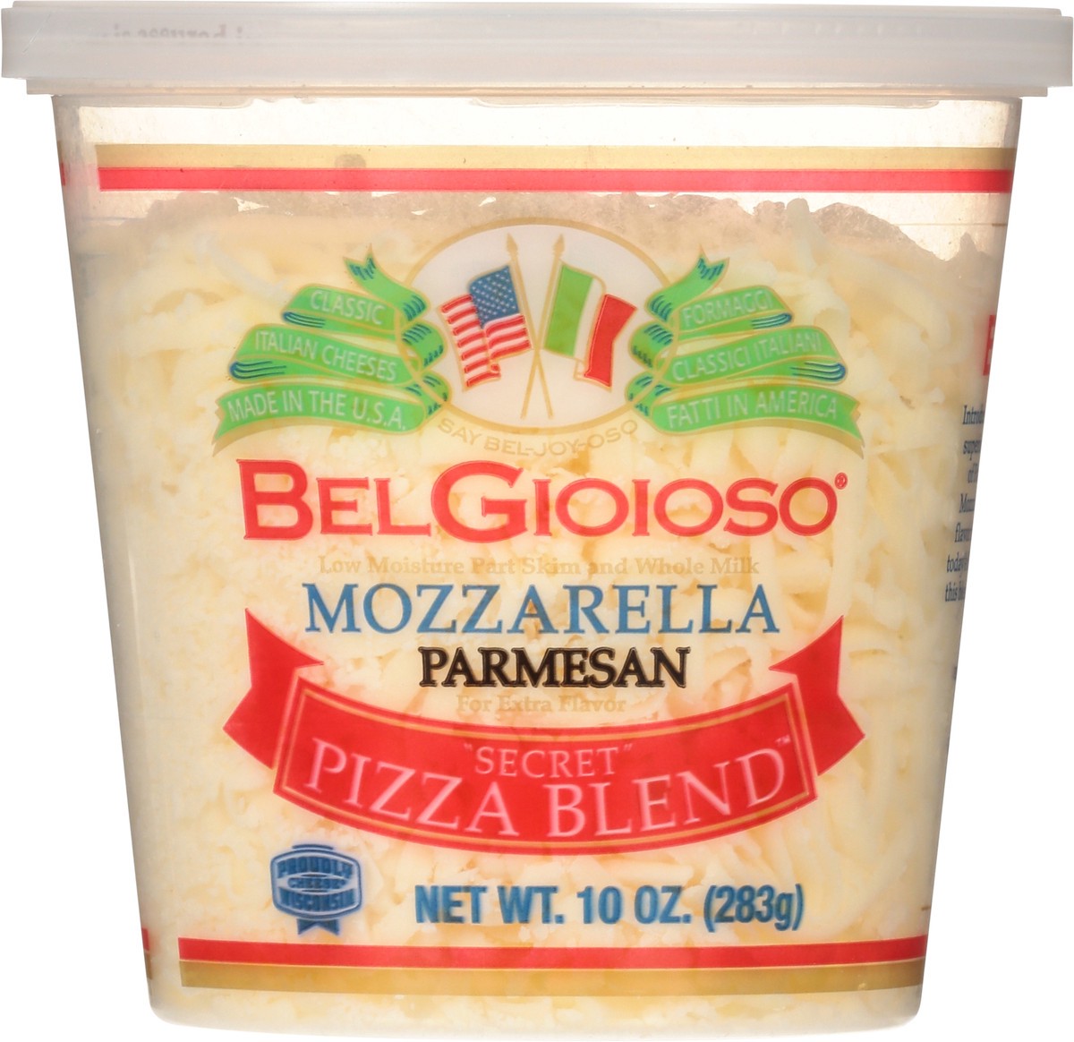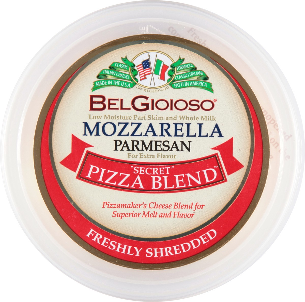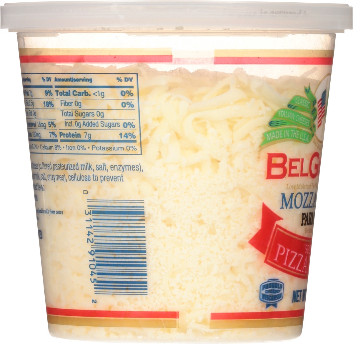 Mozzarella Cheese (Cultured Pasteurized Milk, Salt, Enzymes), Parmesan Cheese (Cultured Milk, Salt, Enzymes), Cellulose to Prevent Caking, Natamycin to Protect Flavor.