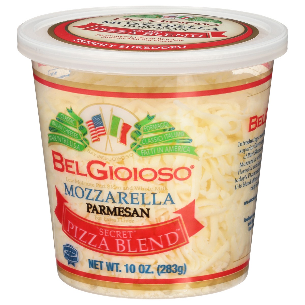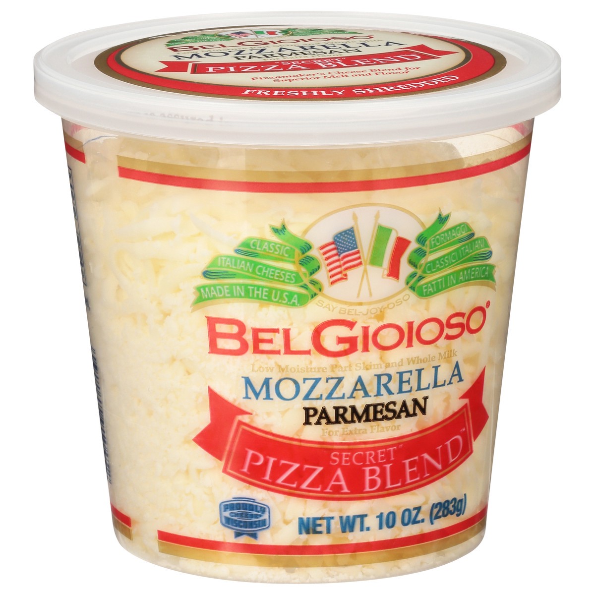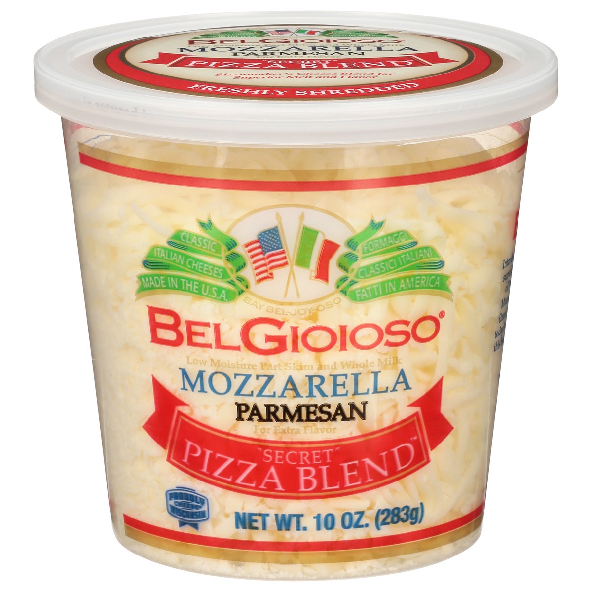 Mozzarella Cheese (Cultured Pasteurized Milk, Salt, Enzymes), Parmesan Cheese (Cultured Milk, Salt, Enzymes), Cellulose to Prevent Caking, Natamycin to Protect Flavor.