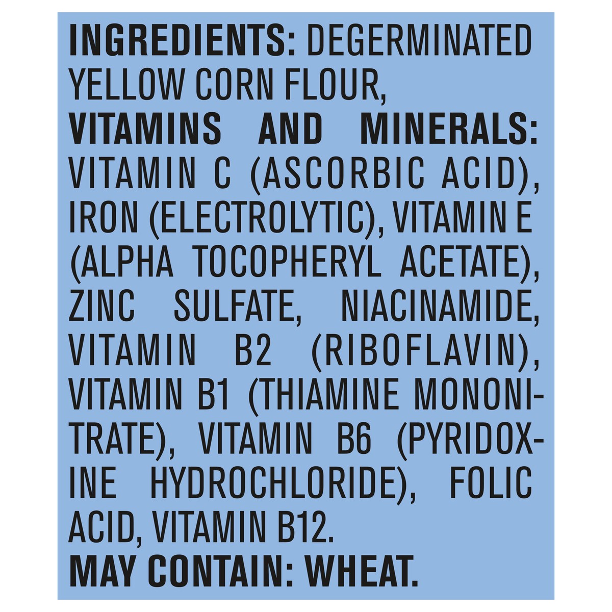 Degerminated Yellow Corn Flour, Vitamins and Minerals: Vitamin C (Ascorbic Acid), Iron (Electrolytic), Vitamin E (Alpha Tocopheryl Acetate), Zinc Sulfate, Niacinamide, Vitamin B2 (Riboflavin), Vitamin…