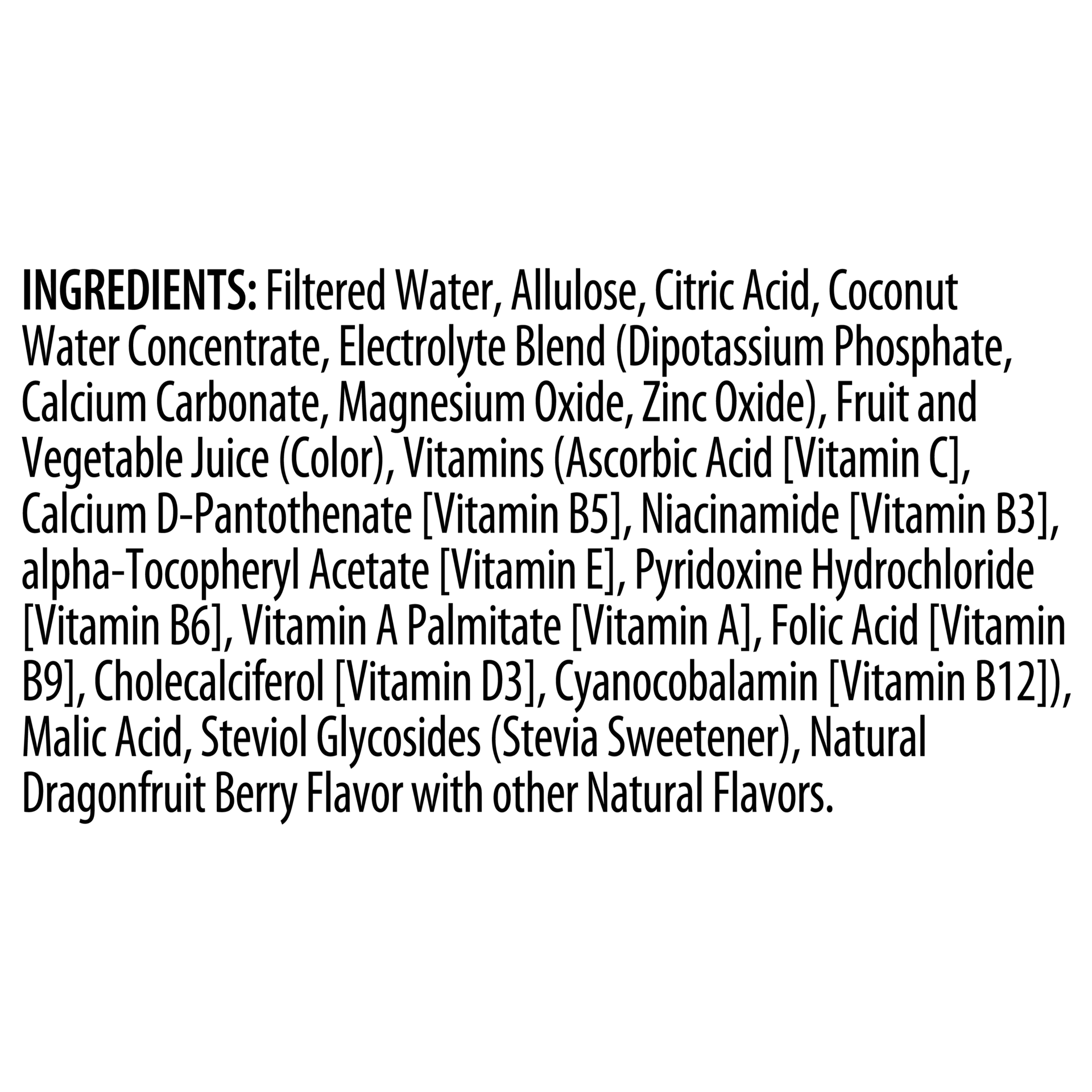 Filtered Water, Allulose, Citric Acid, Coconut Water Concentrate, Electrolyte Blend (Dipotassium Phosphate, Calcium Carbonate, Magnesium Oxide, Zinc Oxide), Fruit And Vegetable Juice (Color), Vitamins…