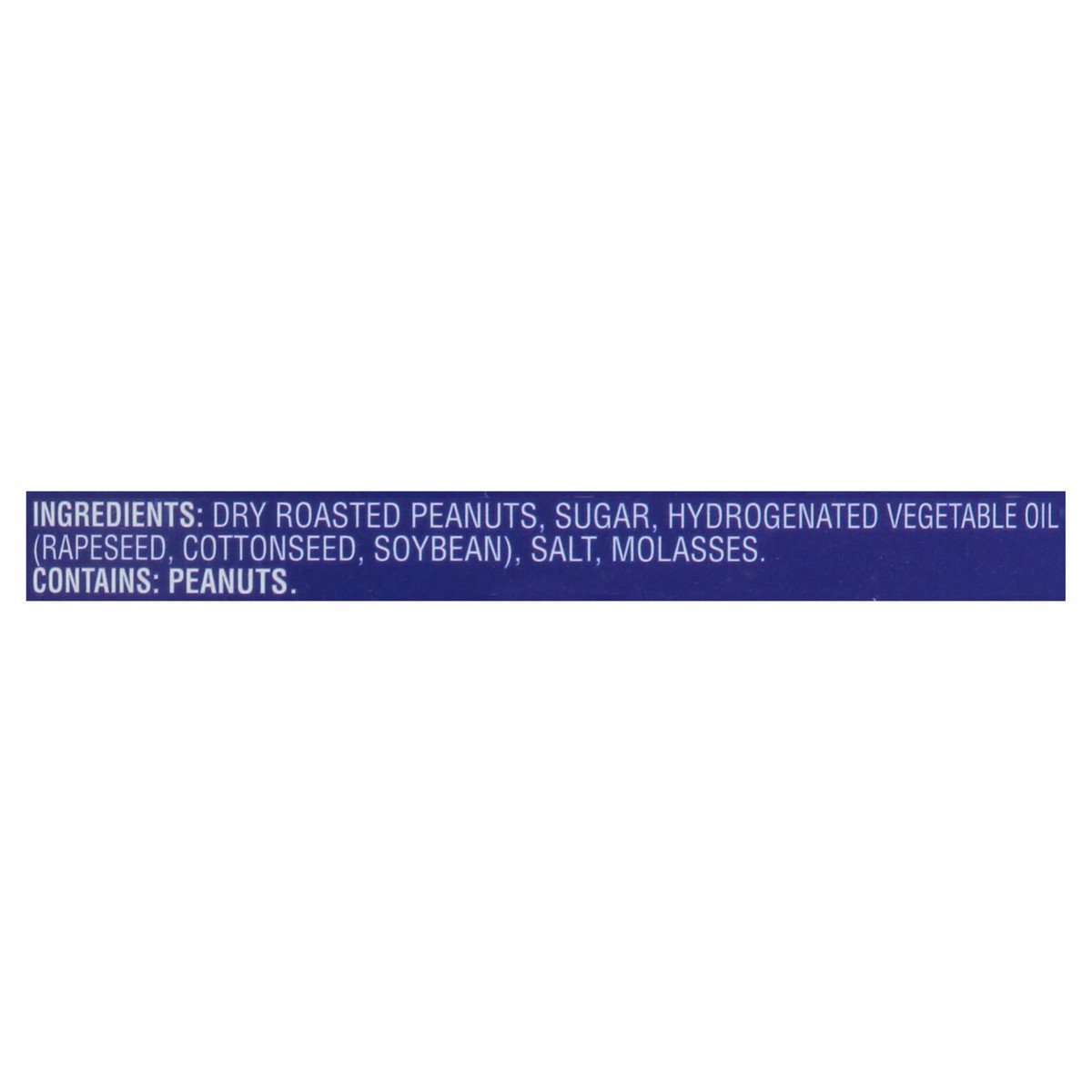 Dry Roasted Peanuts, Sugar, Hydrogenated Vegetable Oil (Rapeseed, Cottonseed, Soybean), Salt, Molasses.