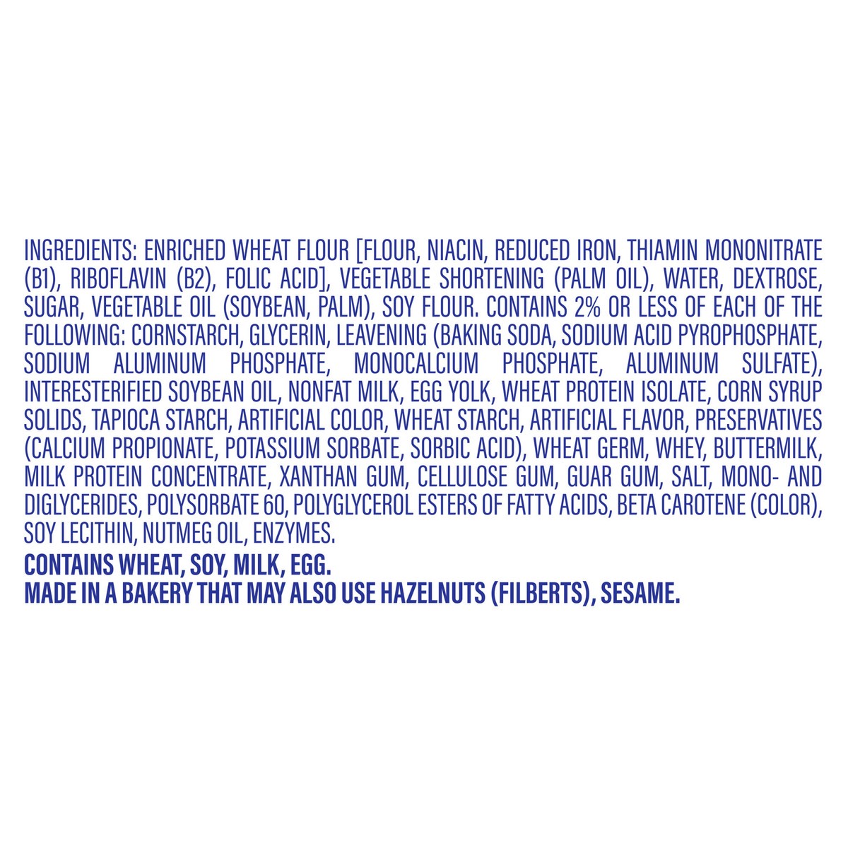 Contains wheat, soy, milk, egg. made in a bakery that may also use hazelnuts (filberts), sesame.