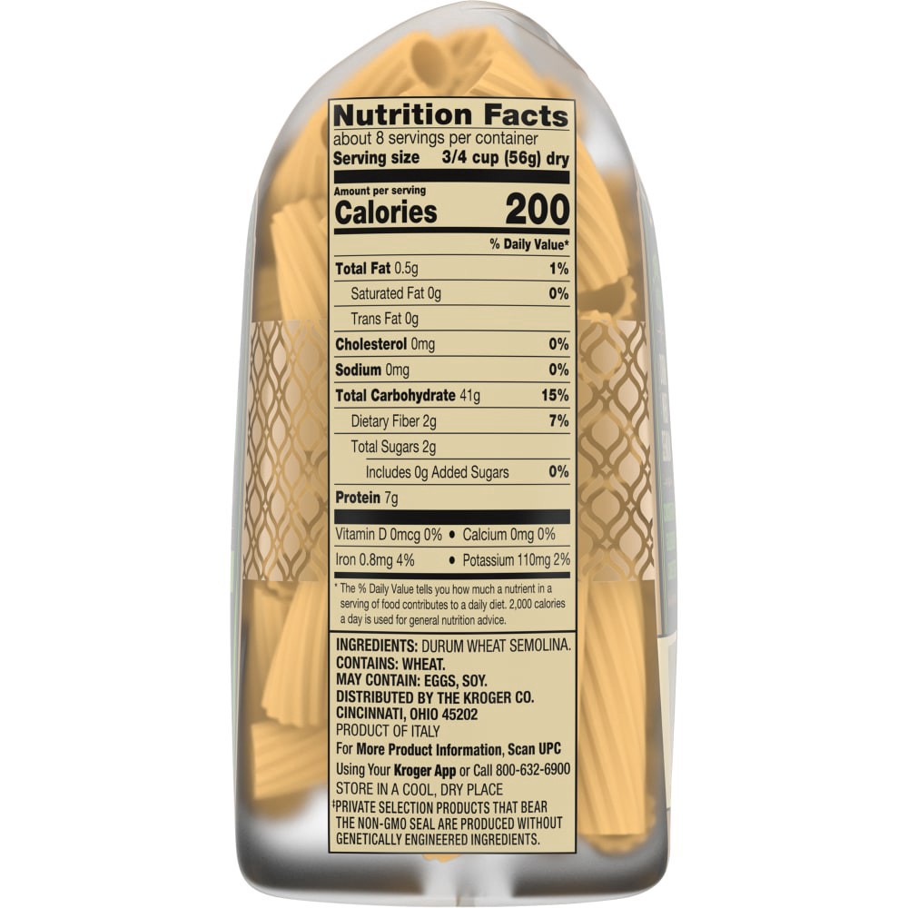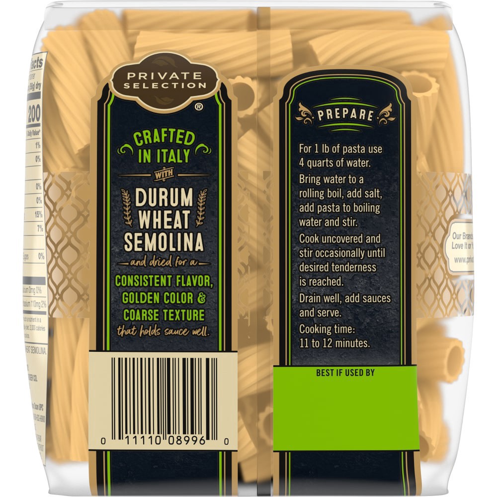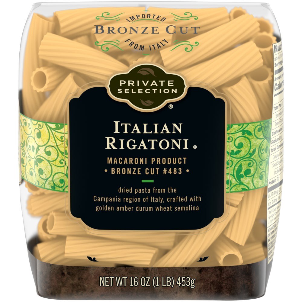 Private selection italian rigatoni is crafted with durum wheat semolina and dried for a consistent flavor golden color and coarse texture that holds sauce well