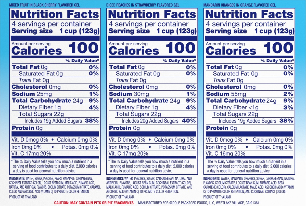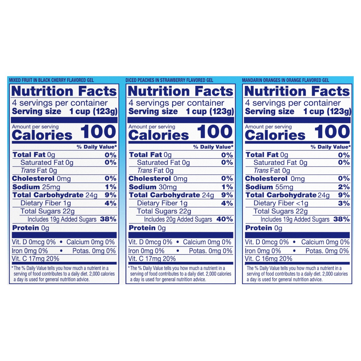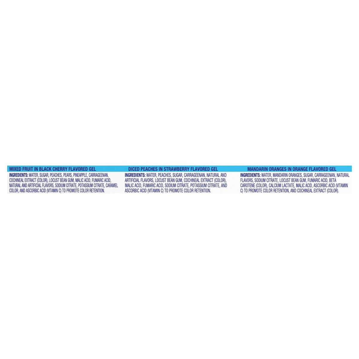Mixed Fruit in Black Cherry Gel: Water, Sugar, Peaches, Pears, Pineapple, Carrageenan, Cochineal Extract (Color), Locust Bean Gum, Malic and Fumaric Acid (to Regulate Acidity), Natural Flavors, Sodium…