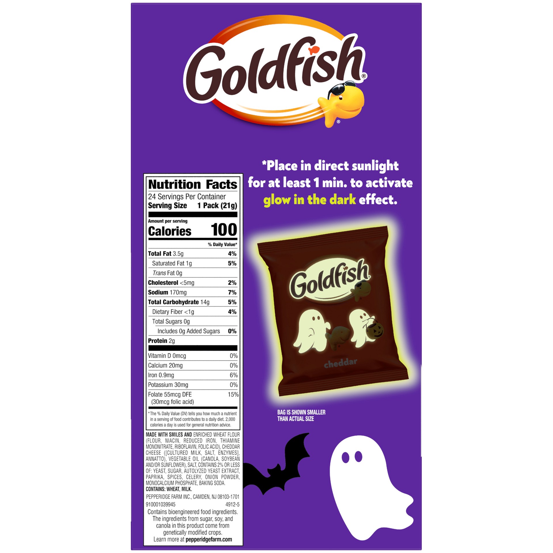Trick-or-treat with Goldfish Cheddar Crackers this Halloween! This multipack box has 24 Goldfish treat bags that are glow in the dark, place them in direct sunlight for at least one minute to activate…