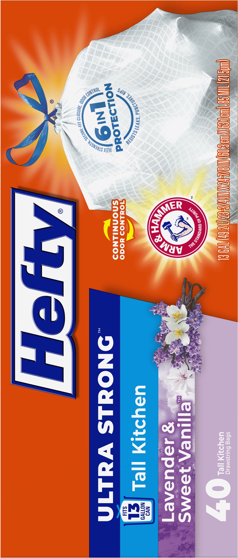 Trust Hefty Ultra Strong 13 Gallon Trash Bags to keep your kitchen waste contained—all the way from the can to the curb. Thanks to 6-in-1 Protection, these tall kitchen trash bags offer flexible stren…